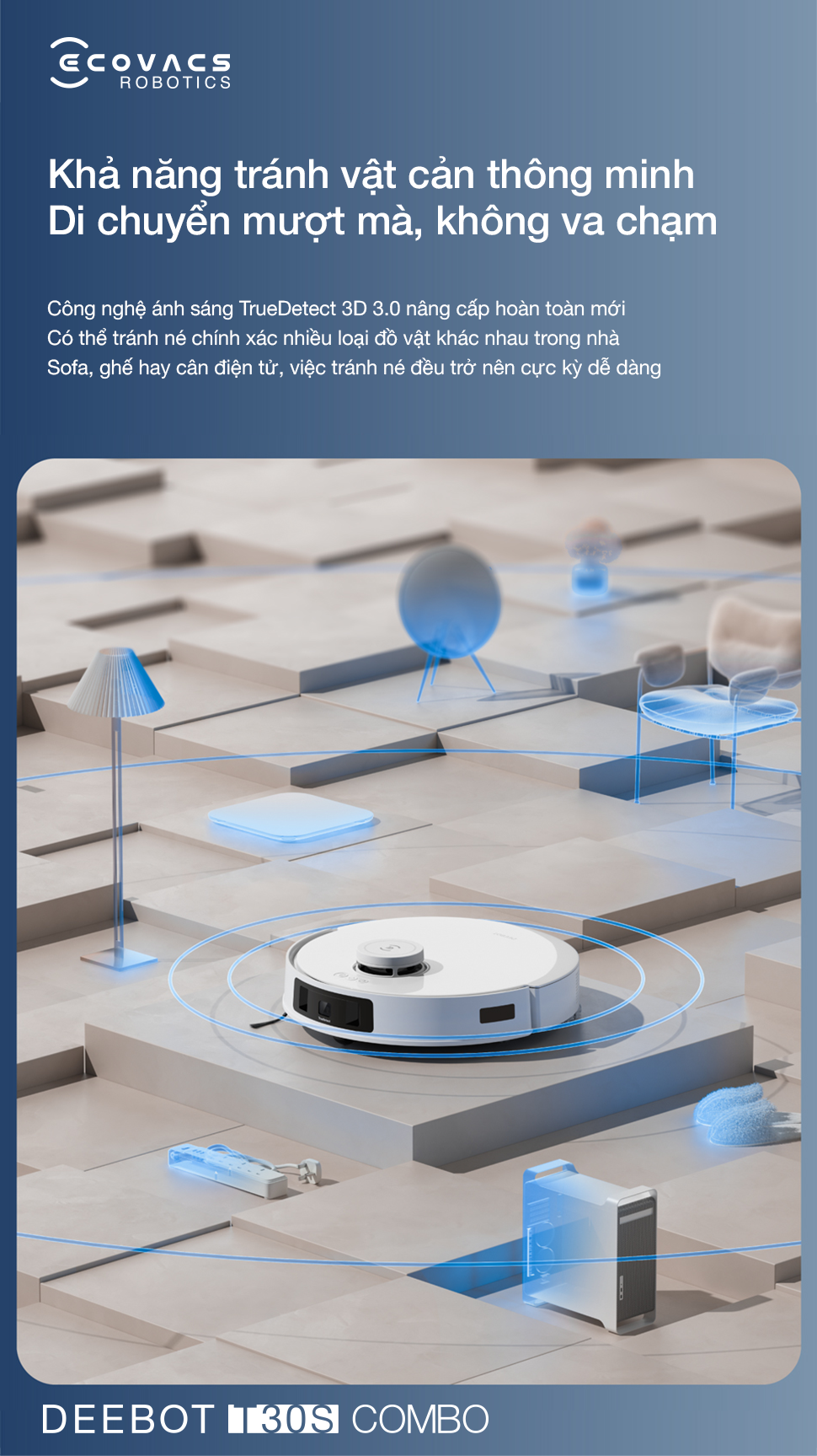 Deebot T30S Combo điều hướng chính xác với TrueDetect 3D 3.0, vượt chướng ngại vật cao 20mm