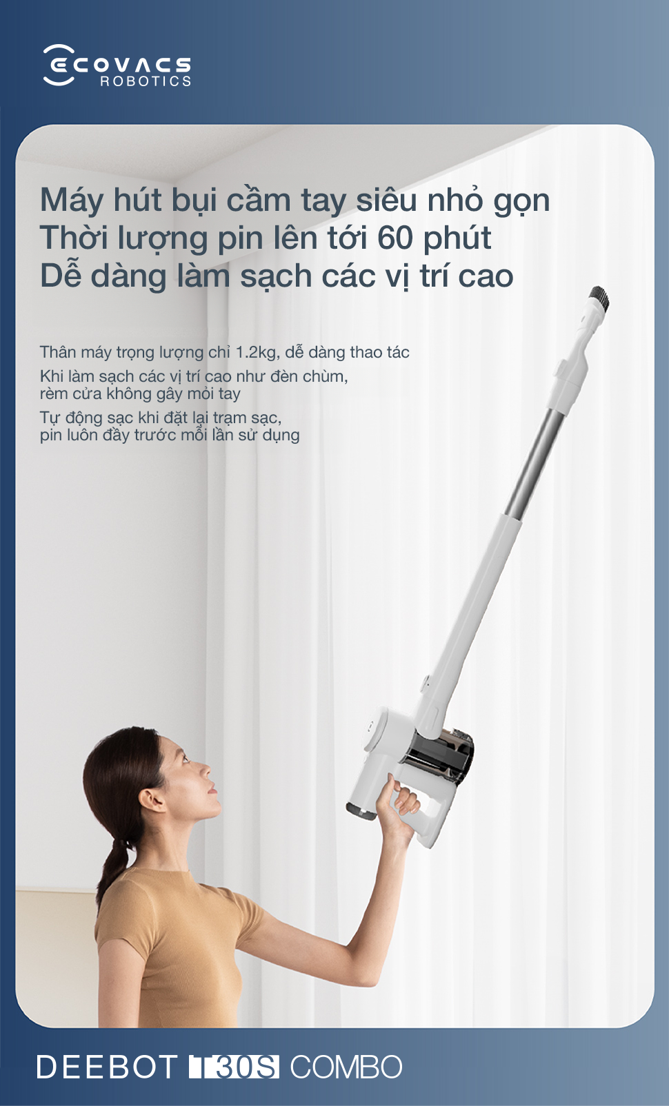 Sở hữu thiết kế siêu nhẹ chỉ tương đương với hai chai nước khoáng, Robot hút bụi lau nhà và máy hút bụi cầm tay Ecovacs Deebot T30S Combo 2026 mang đến sự linh hoạt tối đa trong suốt quá trình dọn dẹp. Trọng lượng lý tưởng chỉ 1.2kg giúp bạn thao tác nhẹ nhàng, thoải mái làm sạch mọi vị trí trong thời gian dài mà không lo mỏi tay, nâng tầm trải nghiệm sống hiện đại và tiện nghi.