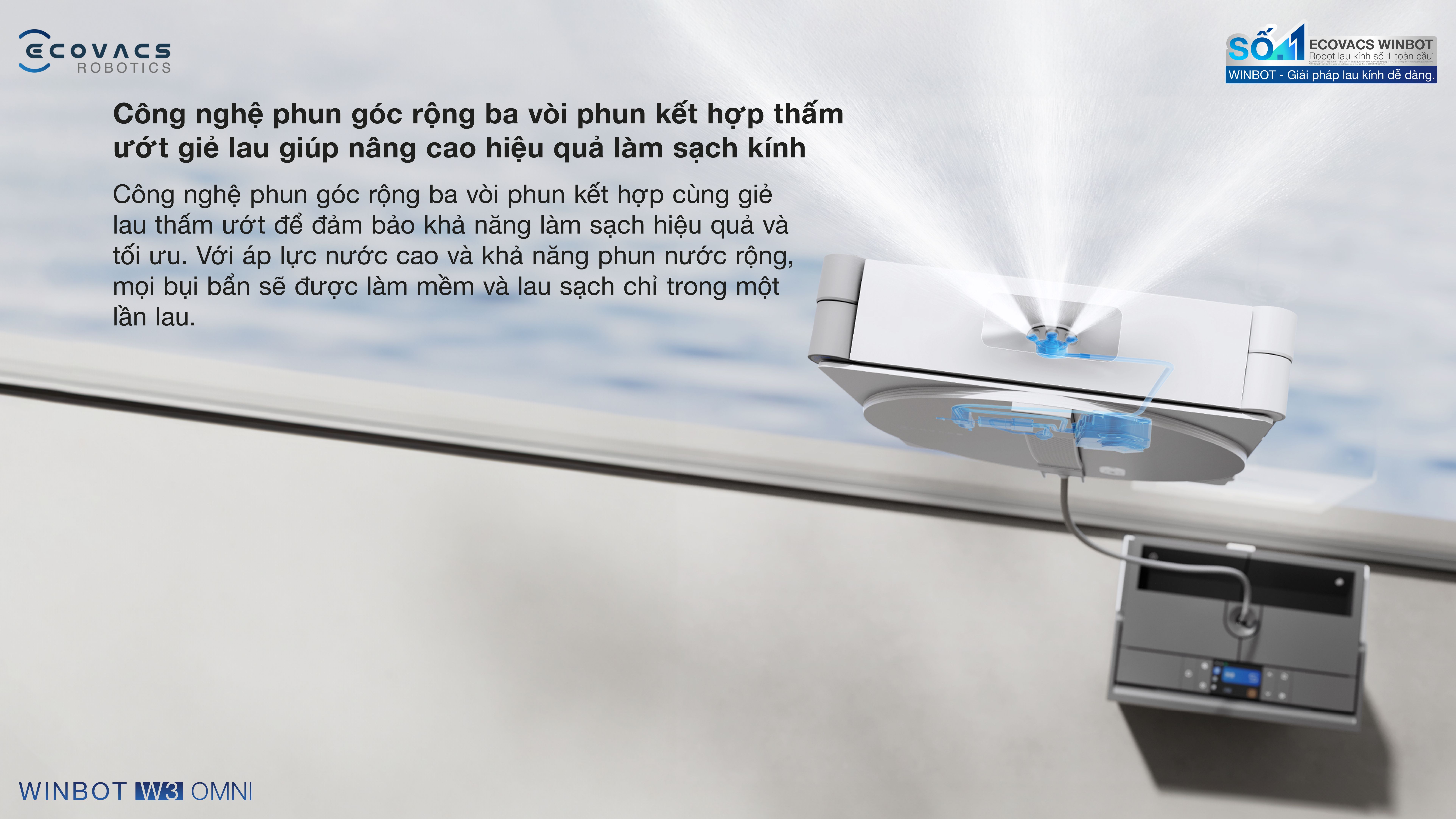 Winbot W3 Omni được trang bị công nghệ phun góc rộng ba vòi kết hợp cây lau ướt