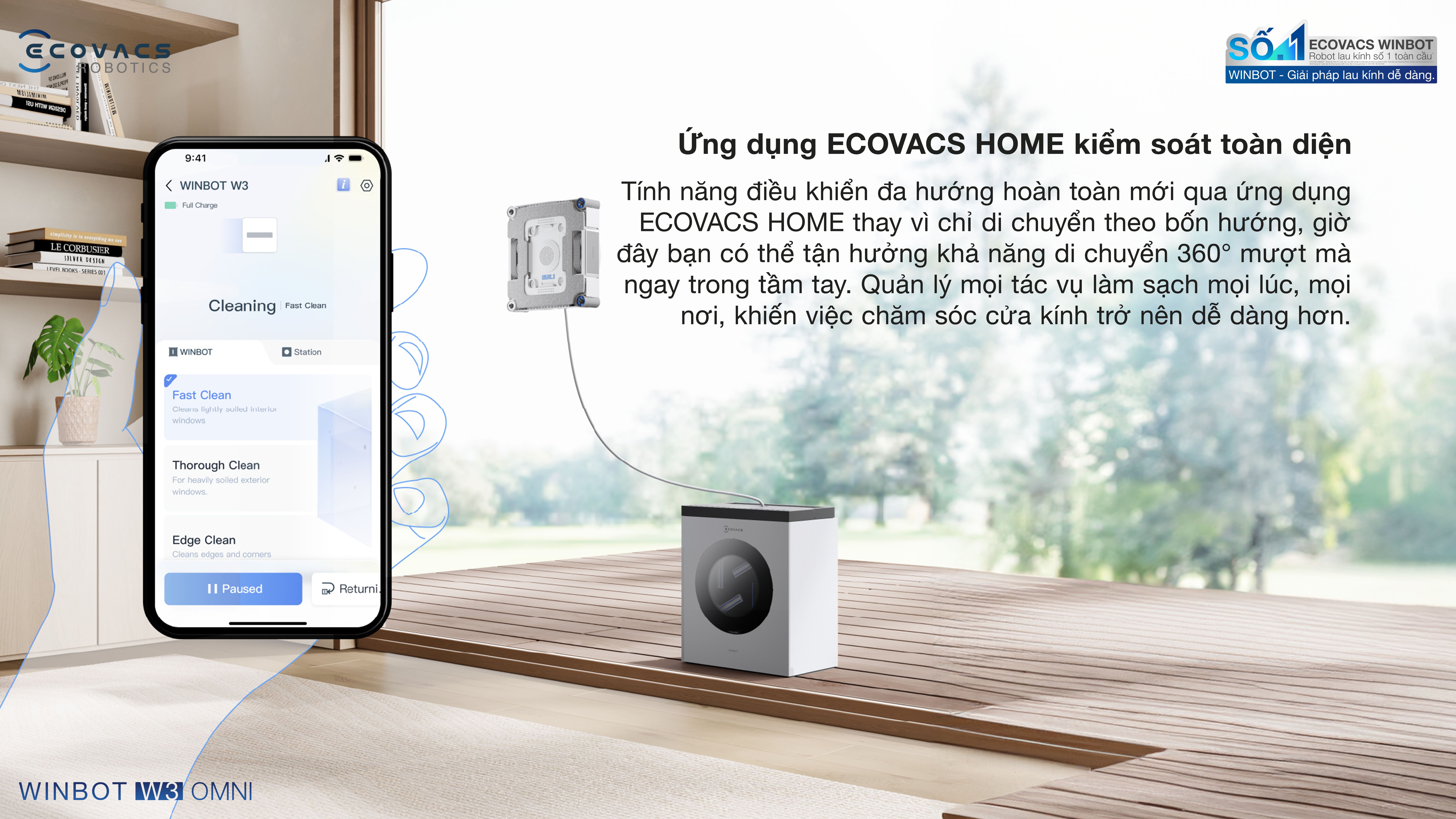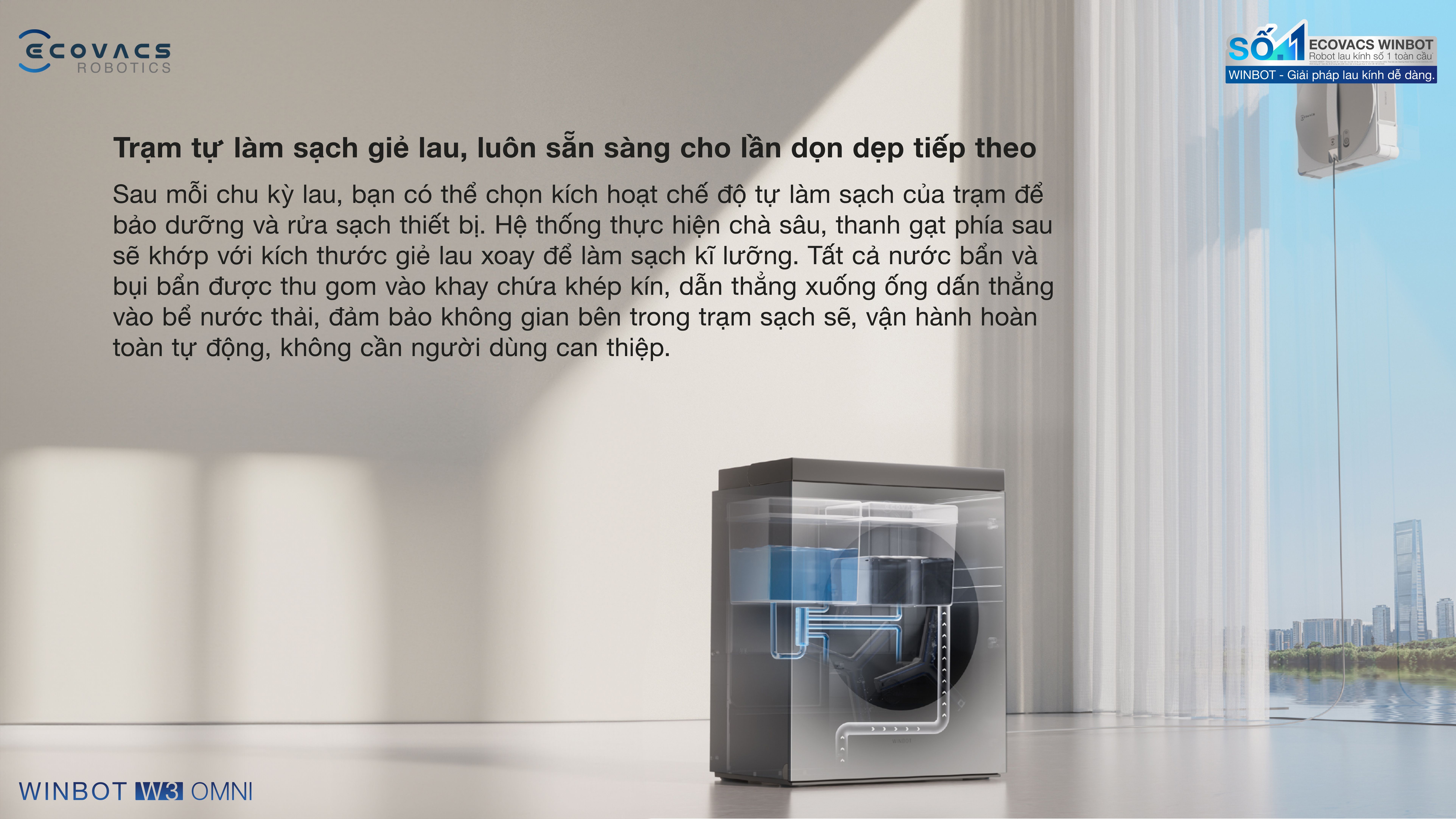 Ecovacs Winbot W3 Omni tự làm sạch trạm, khăn lau có khả năng giữ nước cao