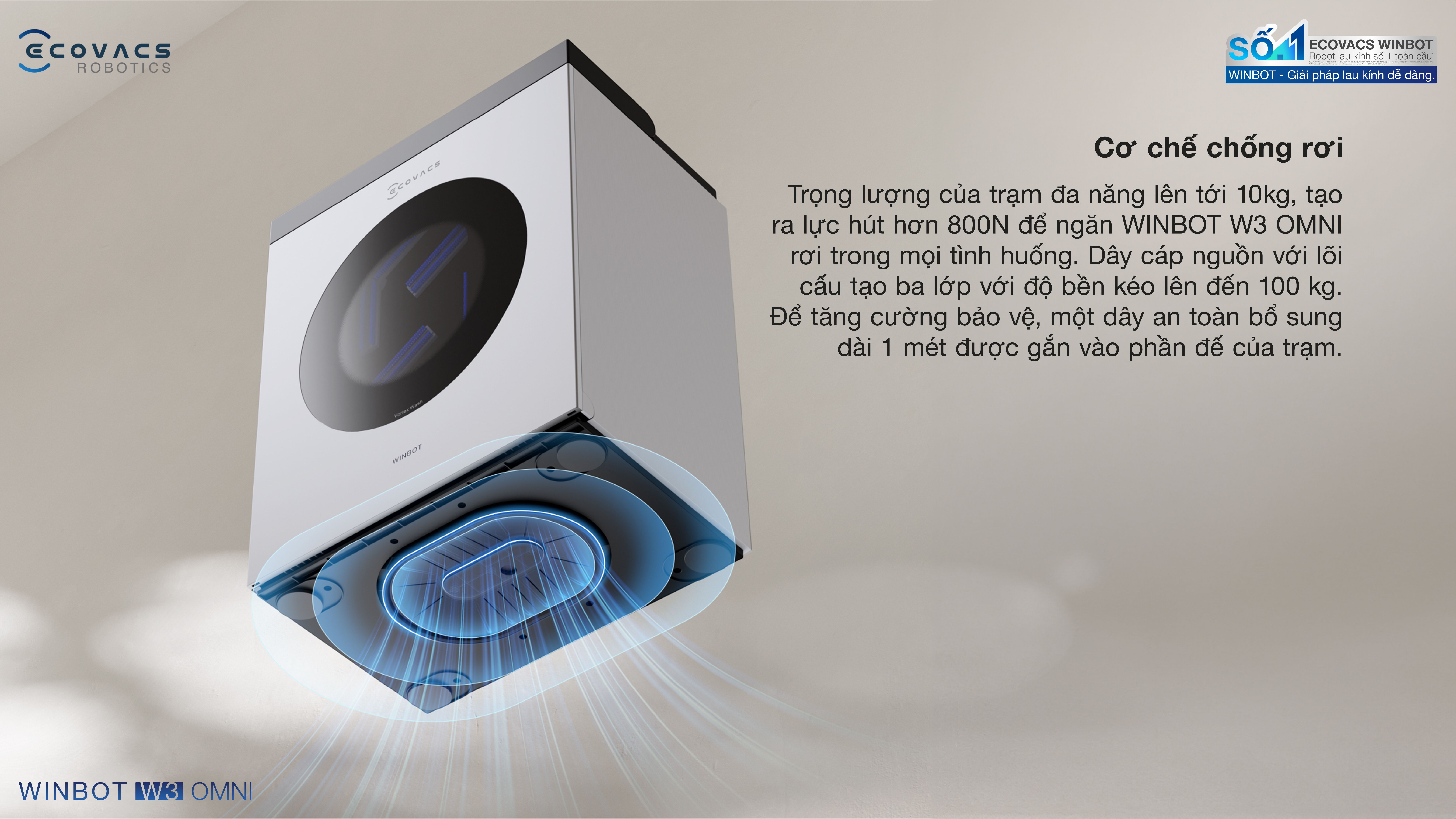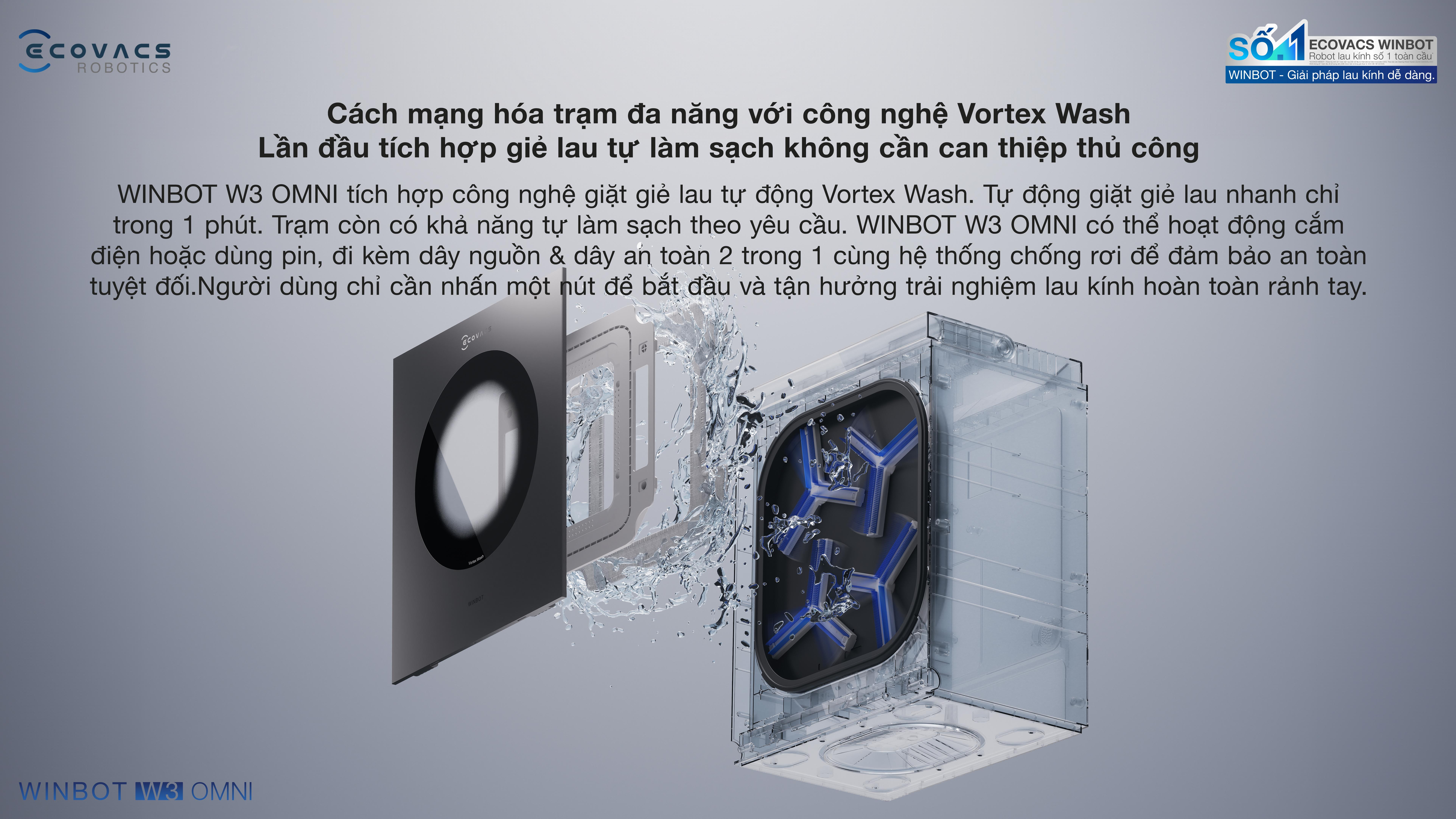 Robot lau kính Ecovacs Winbot W3 Omni nổi bật nhờ công nghệ giặt khăn lau Vortex Wash, khả năng tự làm sạch trạm, khăn lau giữ nước tốt giúp duy trì hiệu quả làm sạch liên tục. Cáp đa năng hai trong một tích hợp dây nguồn cùng dây an toàn hỗ trợ chống rơi, tăng độ ổn định khi hoạt động. Thiết bị hỗ trợ cả chế độ cắm điện lẫn dùng pin, phù hợp nhiều không gian khác nhau.