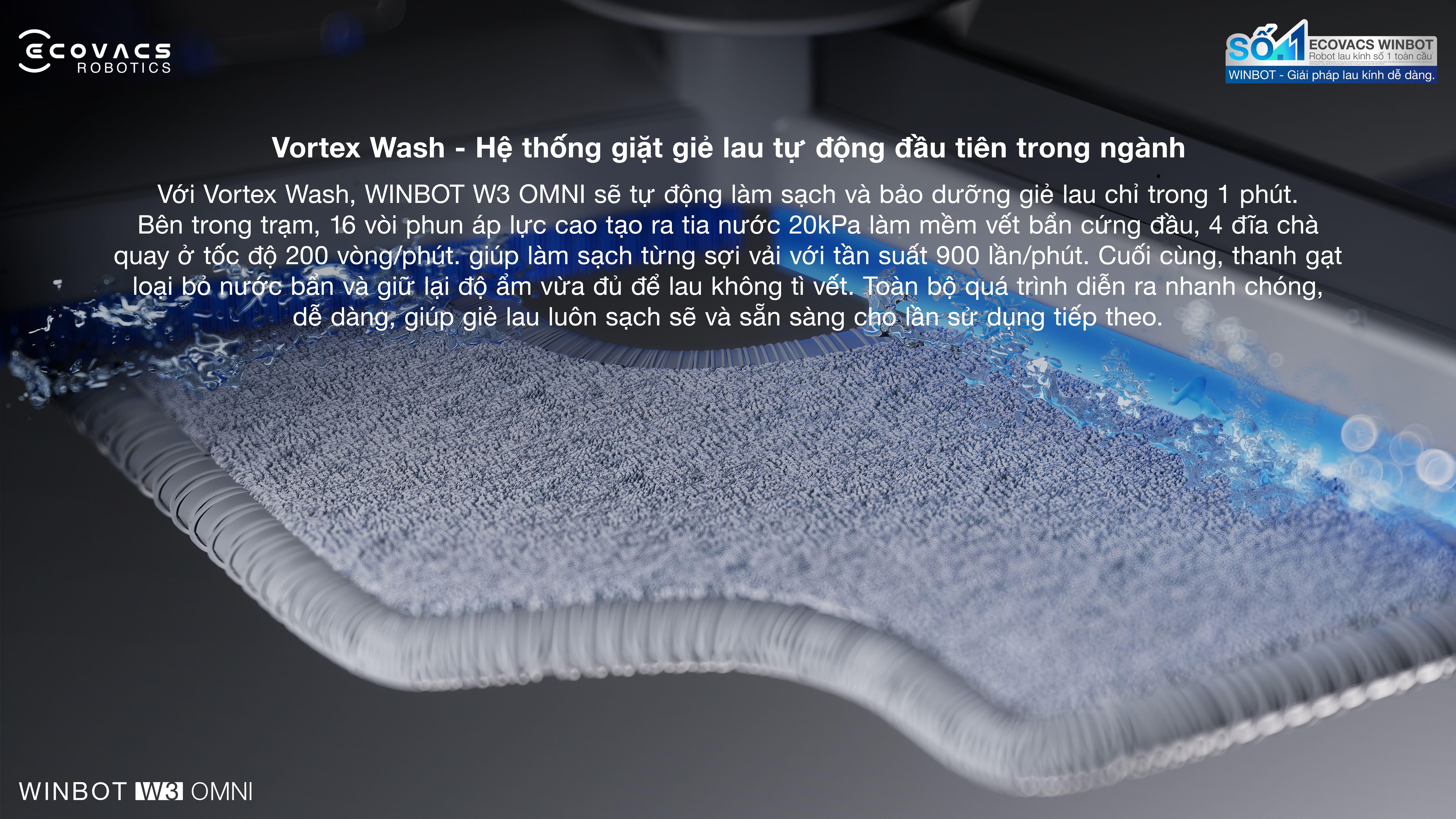 Robot lau kính Ecovacs Winbot W3 Omni sở hữu công nghệ giặt khăn lau Vortex Wash