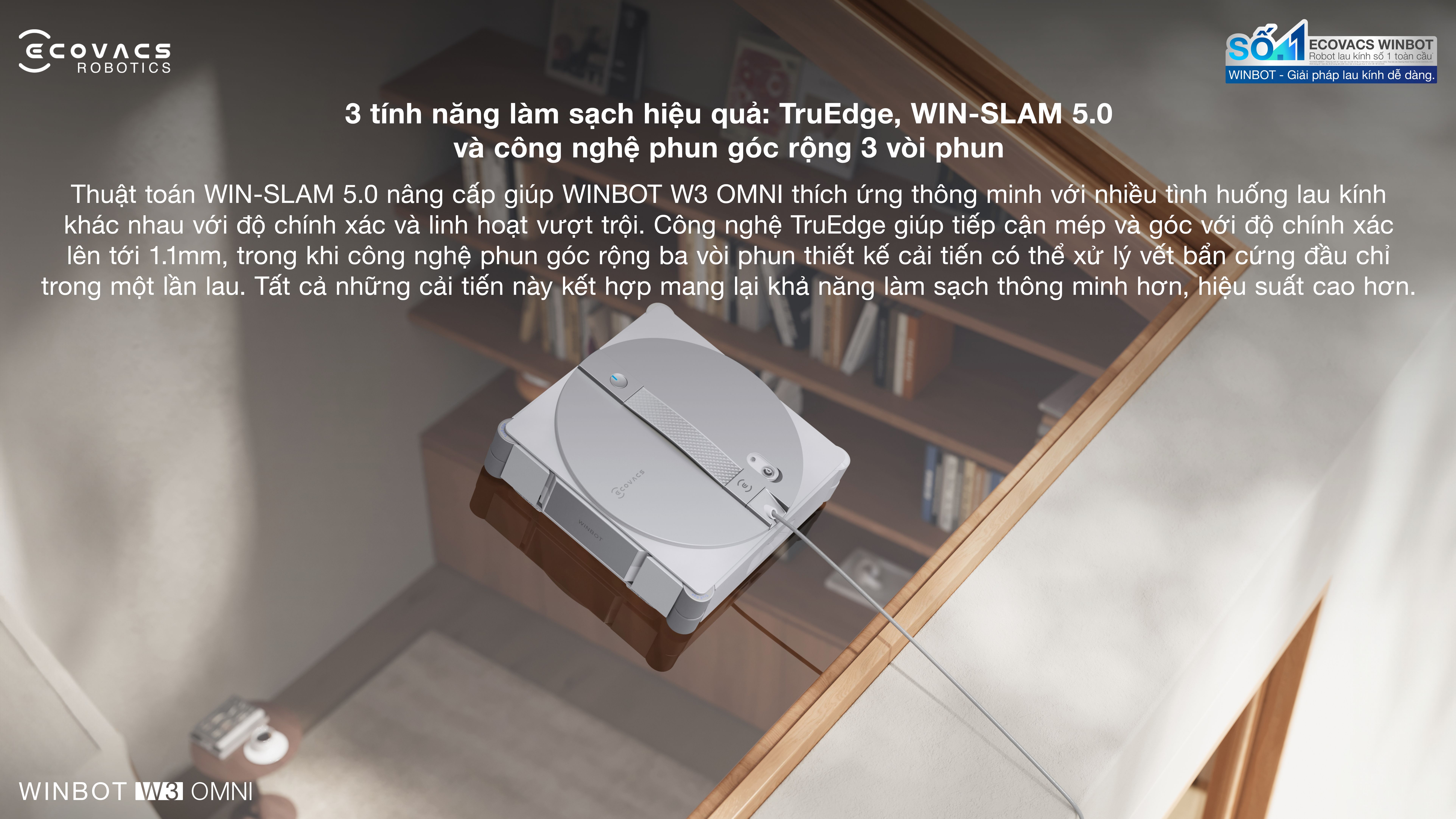 Thuật toán WIN-SLAM 5.0 cho khả năng điều hướng thông minh cho Ecovacs Winbot W3 Omni trong nhiều môi trường khác nhau. Nhờ kết hợp đa cảm biến, thiết bị nhận diện vật cản chính xác đến từng milimet, di chuyển linh hoạt trên bề mặt kính, kể cả khu vực phức tạp như phòng tắm hay ban công. Tốc độ làm sạch đạt tới 16 cm/giây giúp rút ngắn thời gian vận hành nhưng vẫn đảm bảo hiệu quả. Hệ thống còn cung cấp nhiều chế độ như làm sạch cạnh, làm sạch nhanh, làm sạch mạnh, làm sạch điểm, làm sạch sâu, làm sạch kỹ lưỡng hoặc theo khu vực, giúp người dùng dễ dàng lựa chọn phù hợp theo từng nhu cầu sử dụng.