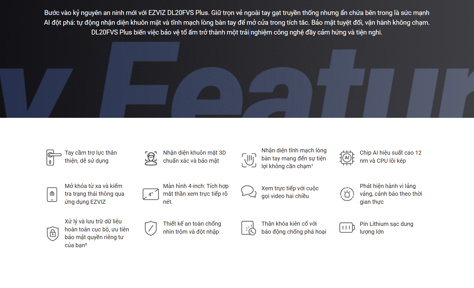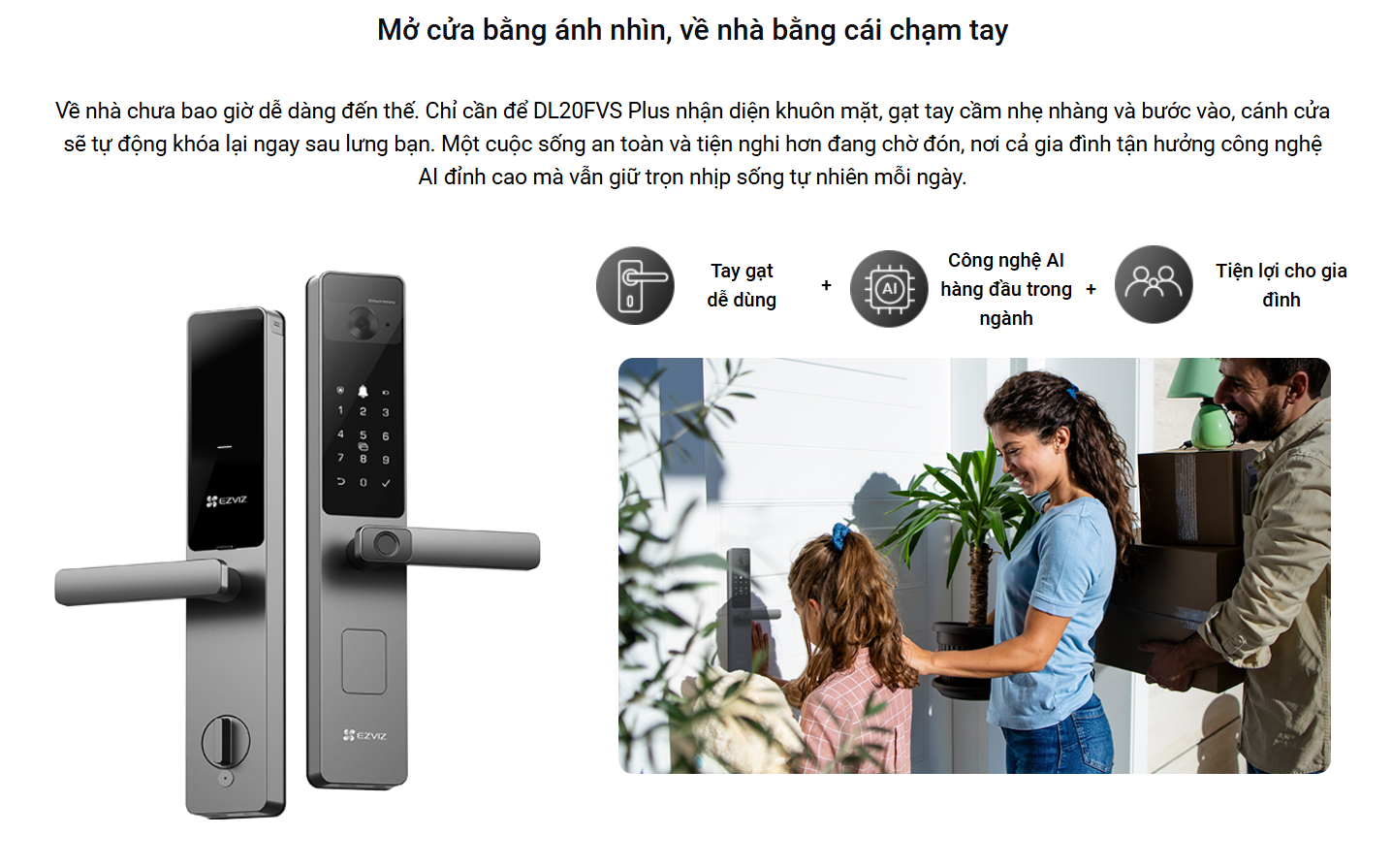Trong thời đại công nghệ phát triển mạnh mẽ, nhu cầu bảo vệ an ninh cho ngôi nhà không chỉ dừng lại ở khóa cơ truyền thống. Khóa thông minh Ezviz DL20FVS Plus mang đến một chuẩn mực hoàn toàn mới khi kết hợp thiết kế tay gạt cổ điển với công nghệ AI tiên tiến như nhận diện khuôn mặt 3D và tĩnh mạch lòng bàn tay. Đây chính là giải pháp an ninh toàn diện, tiện nghi và an toàn cho mọi gia đình hiện đại.