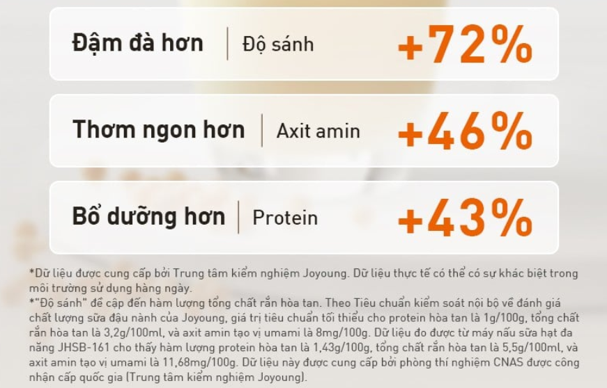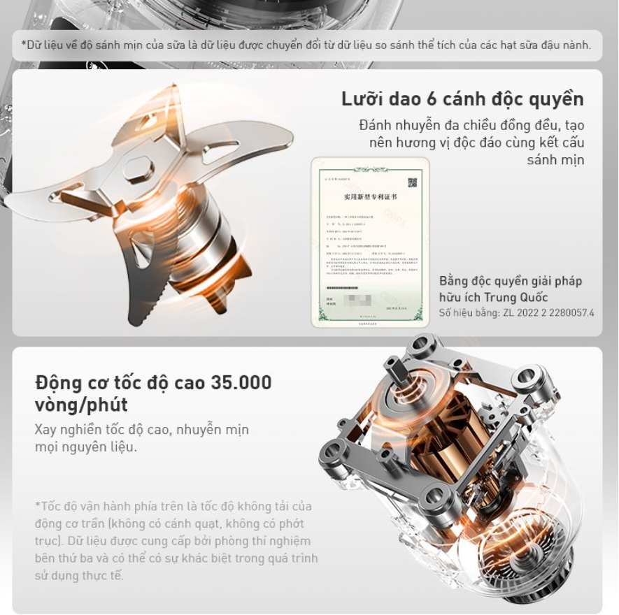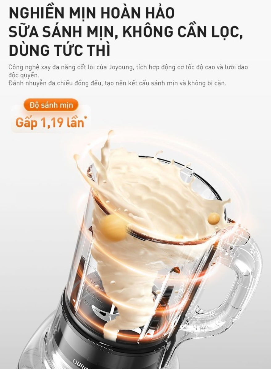 Joyoung JHSB-161 được trang bị động cơ tốc độ cao 35.000 vòng/phút kết hợp với lưỡi dao 6 cánh thép không gỉ 420 sắc bén, giúp nghiền nhuyễn hoàn hảo mọi loại hạt từ đậu nành, hạnh nhân đến yến mạch. Nhờ đó, sữa thành phẩm có độ sánh mịn cao gấp 1.19 lần so với máy thông thường, có thể uống ngay không cần lọc lại.