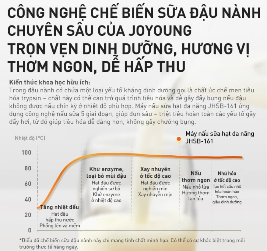 Cơ chế nấu 5 giai đoạn thông minh giúp hạt được nấu chín kỹ, loại bỏ hoàn toàn các yếu tố gây đầy hơi, mang đến ly sữa thơm ngon, dễ tiêu hóa và giàu dưỡng chất.