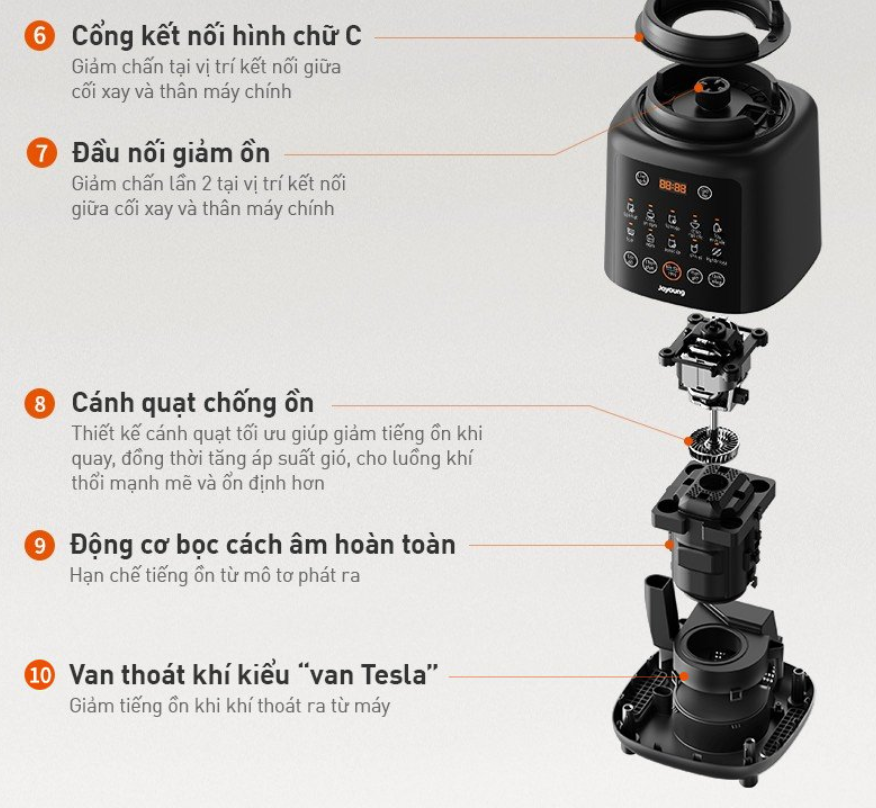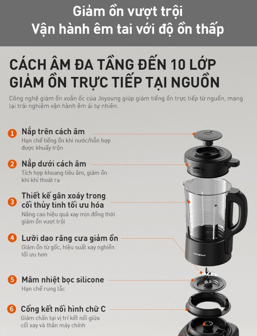 Máy nấu sữa hạt Joyoung JHSB-161 ứng dụng 10 lớp cách âm đa tầng và ống thoát khí xoắn ốc độc quyền Joyoung, giúp giảm thiểu tiếng ồn phát sinh ngay tại nguồn. Nhờ đó, máy vận hành êm ái và yên tĩnh, lý tưởng cho không gian gia đình — bạn có thể thoải mái sử dụng vào buổi sáng sớm mà không làm phiền ai.