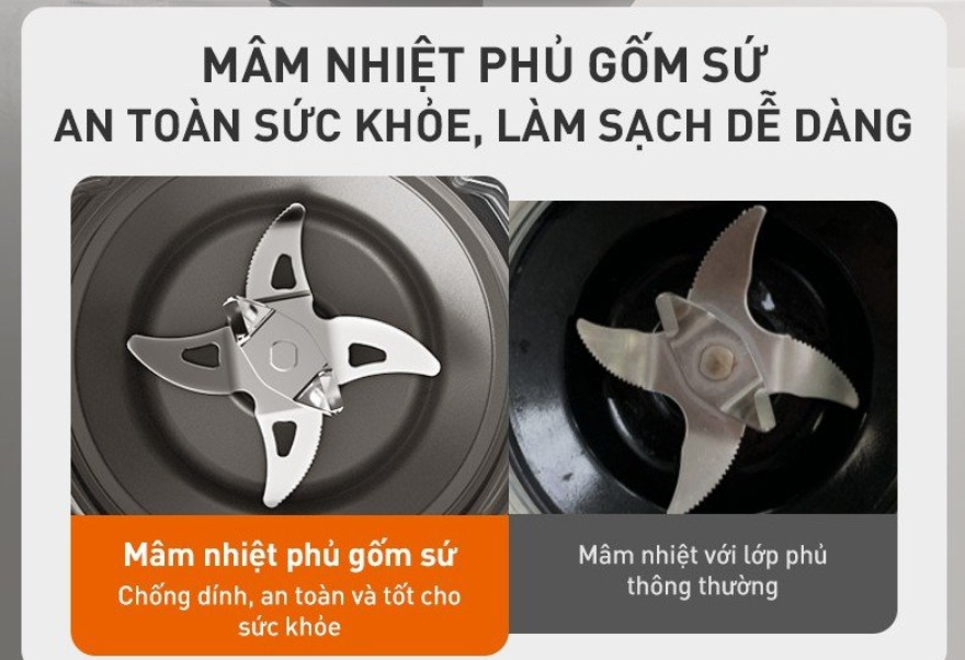 Cối thủy tinh Borosilicate cao cấp chịu nhiệt tốt, chống trầy xước, kết hợp với mâm nhiệt phủ gốm sứ chống dính an toàn, giúp việc vệ sinh trở nên đơn giản và nhanh chóng hơn bao giờ hết.