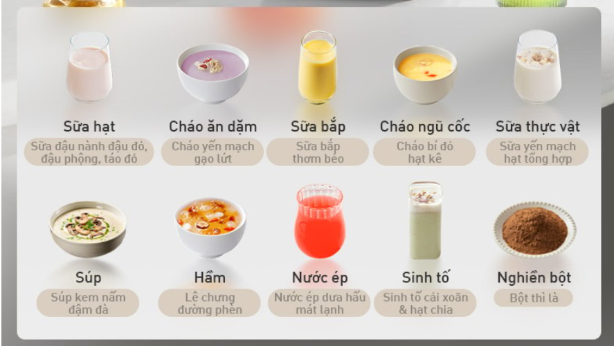 Với 10 chế độ nấu đa năng gồm sữa hạt, sữa bắp, cháo ăn dặm, cháo ngũ cốc, súp… Joyoung JHSB-161 đáp ứng đầy đủ nhu cầu dinh dưỡng hàng ngày.