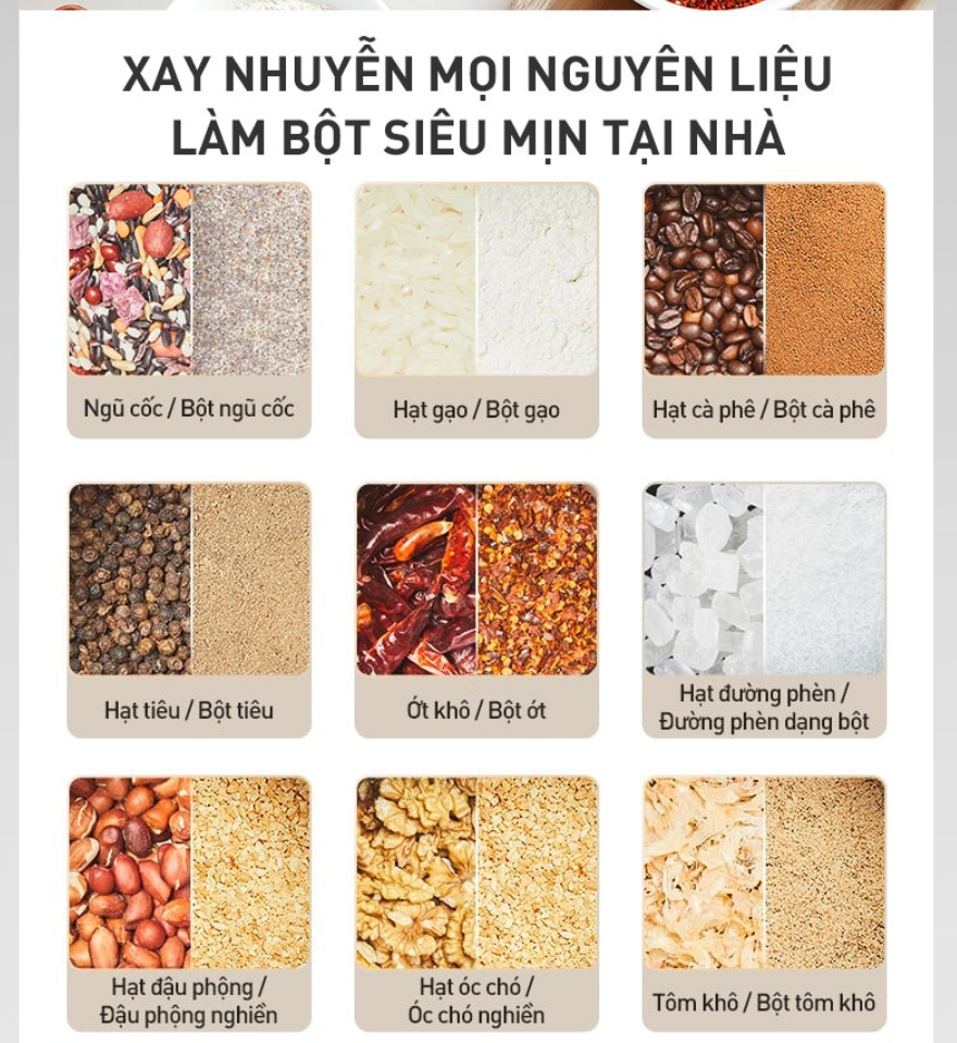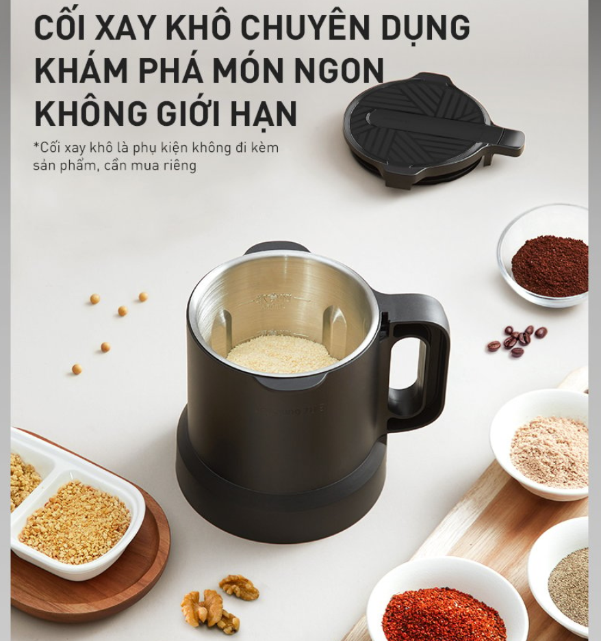 Ngoài ra, máy còn hỗ trợ chức năng nghiền bột khô (phụ kiện mua riêng), giúp bạn dễ dàng xay mịn các loại hạt và ngũ cốc ngay tại nhà.
