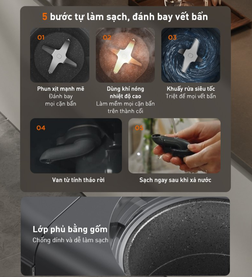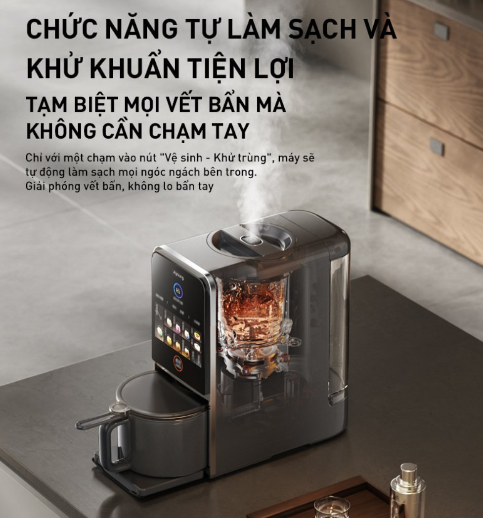 Sau khi nấu xong, máy tự động kích hoạt quy trình rửa sạch bên trong cối, loại bỏ hoàn toàn cặn bã và mảng bám. Người dùng cũng có thể chủ động chọn chế độ “Vệ sinh – Khử trùng” khi cần làm sạch sâu.