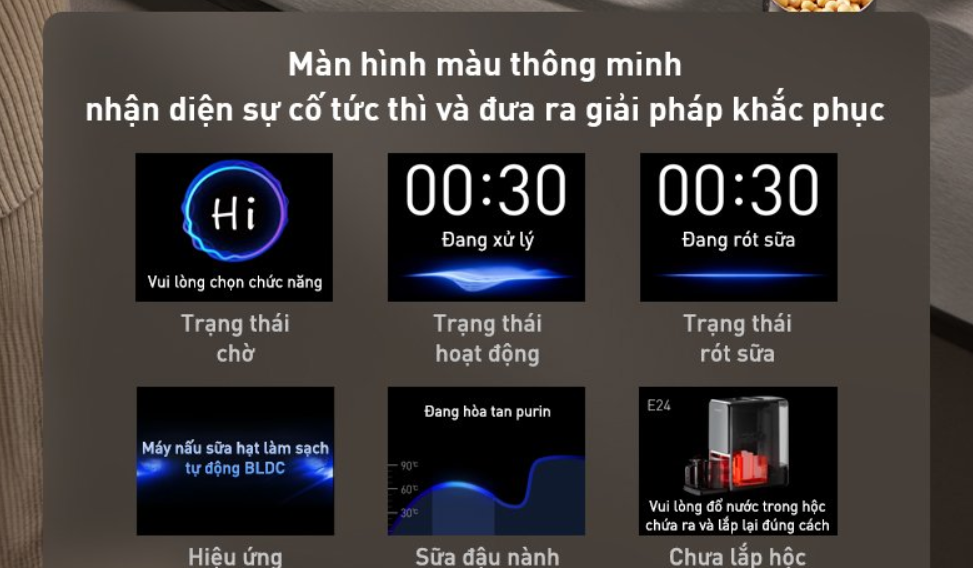 Chỉ cần cho nguyên liệu vào, chọn chế độ trên bảng điều khiển, máy sẽ tự động thực hiện từ xay, nấu đến vệ sinh – mang đến trải nghiệm “một chạm, mọi thứ xong ngay”.