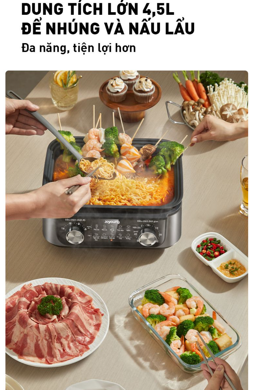Với dung tích 4.5L để nấu lẩu và 11.5L cho các món hấp, bạn có thể dễ dàng chế biến nhiều món ăn cùng lúc, thoải mái đáp ứng nhu cầu của cả gia đình. Joyoung JFS-556 là lựa chọn lý tưởng cho những bữa tiệc gia đình hoặc những buổi tụ tập bạn bè.