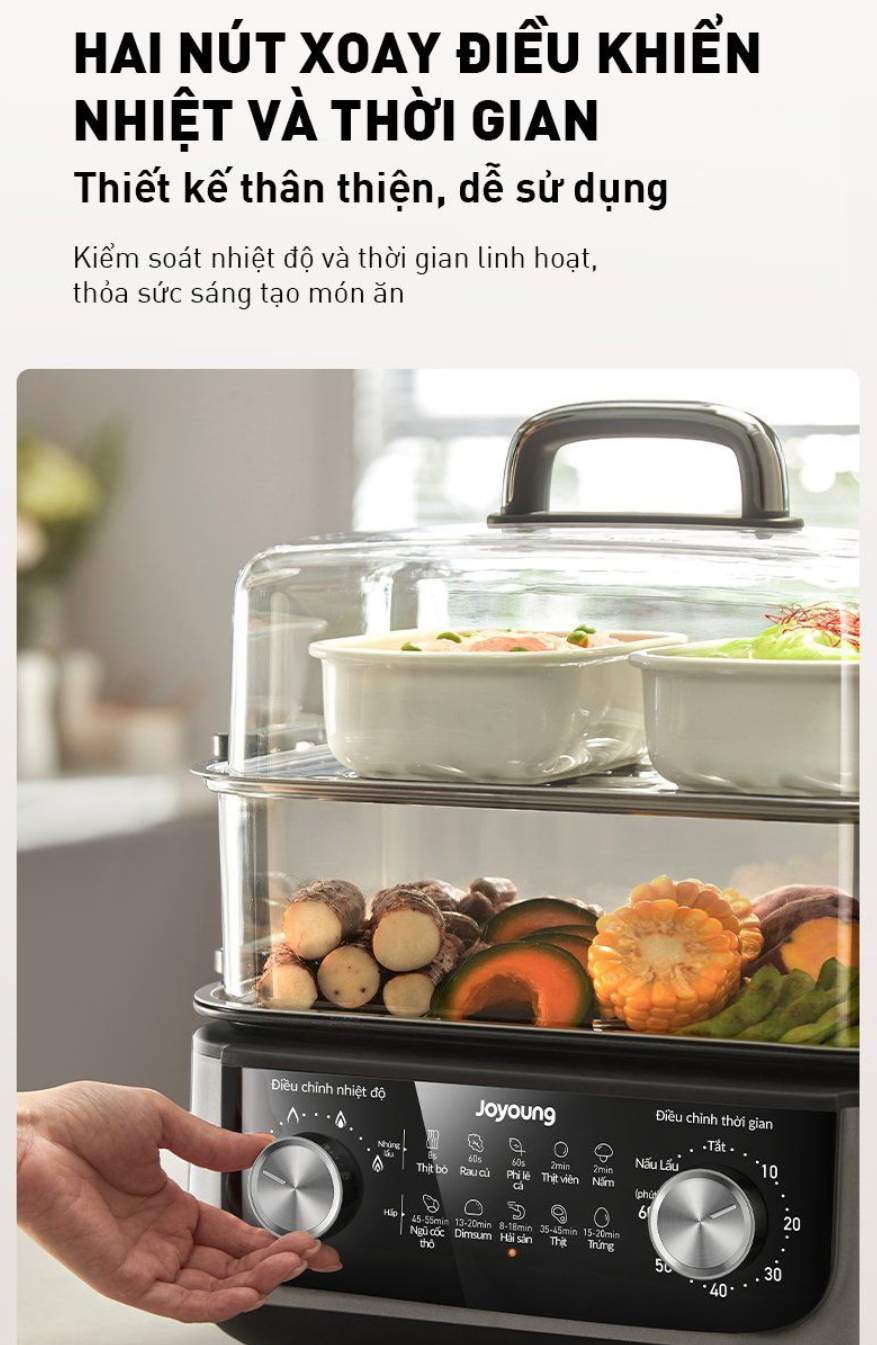 Nồi lẩu hấp Joyoung có thiết kế thân thiện với hai nút điều chỉnh nhiệt độ và thời gian dễ sử dụng. Bạn có thể dễ dàng điều chỉnh nhiệt độ phù hợp với từng món ăn, từ lẩu sôi sùng sục đến món hấp chín tới. Chức năng hẹn giờ tiện lợi giúp bạn rảnh tay làm những việc khác trong khi chờ món ăn hoàn thành.