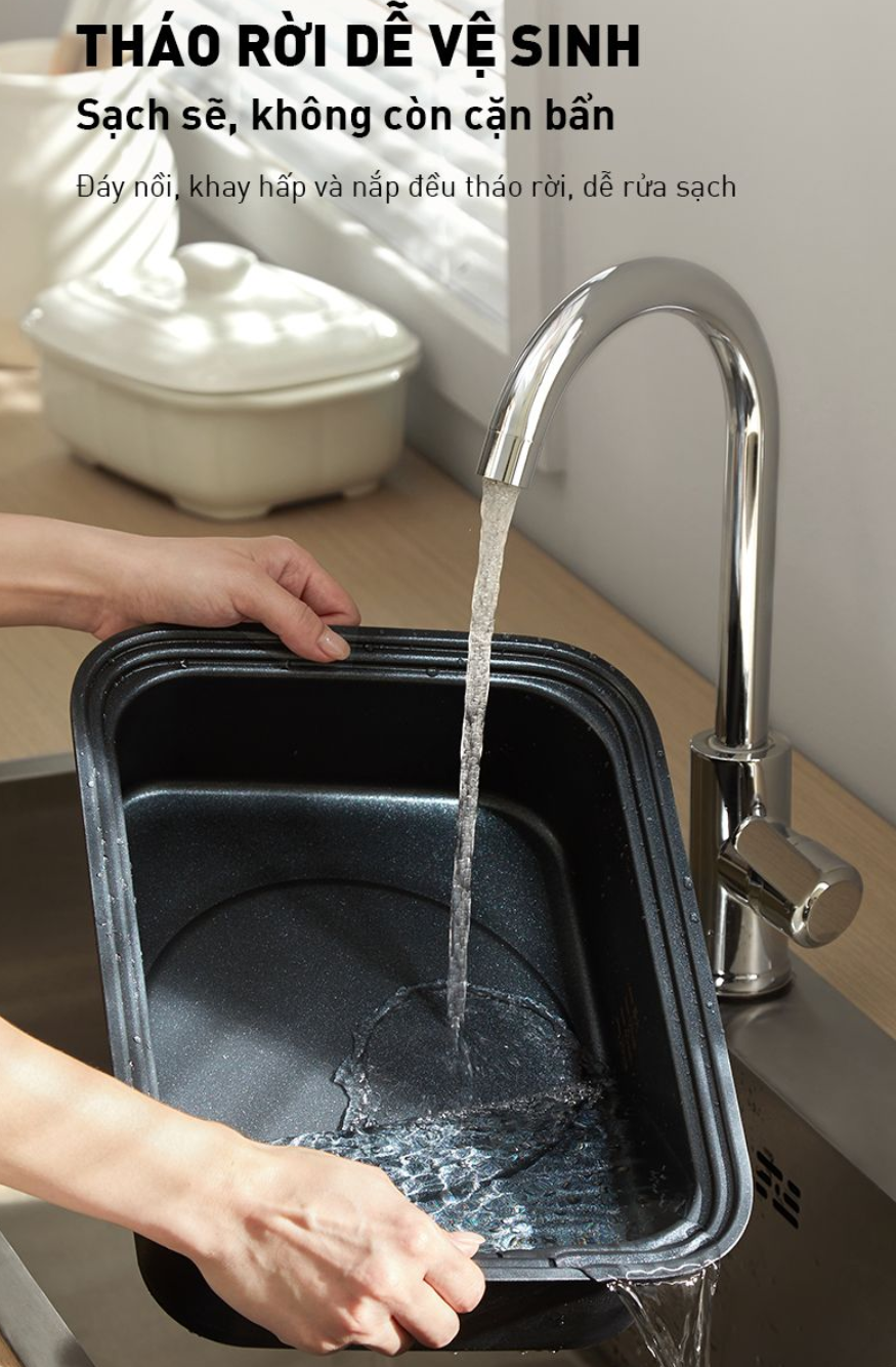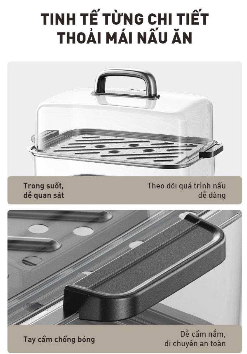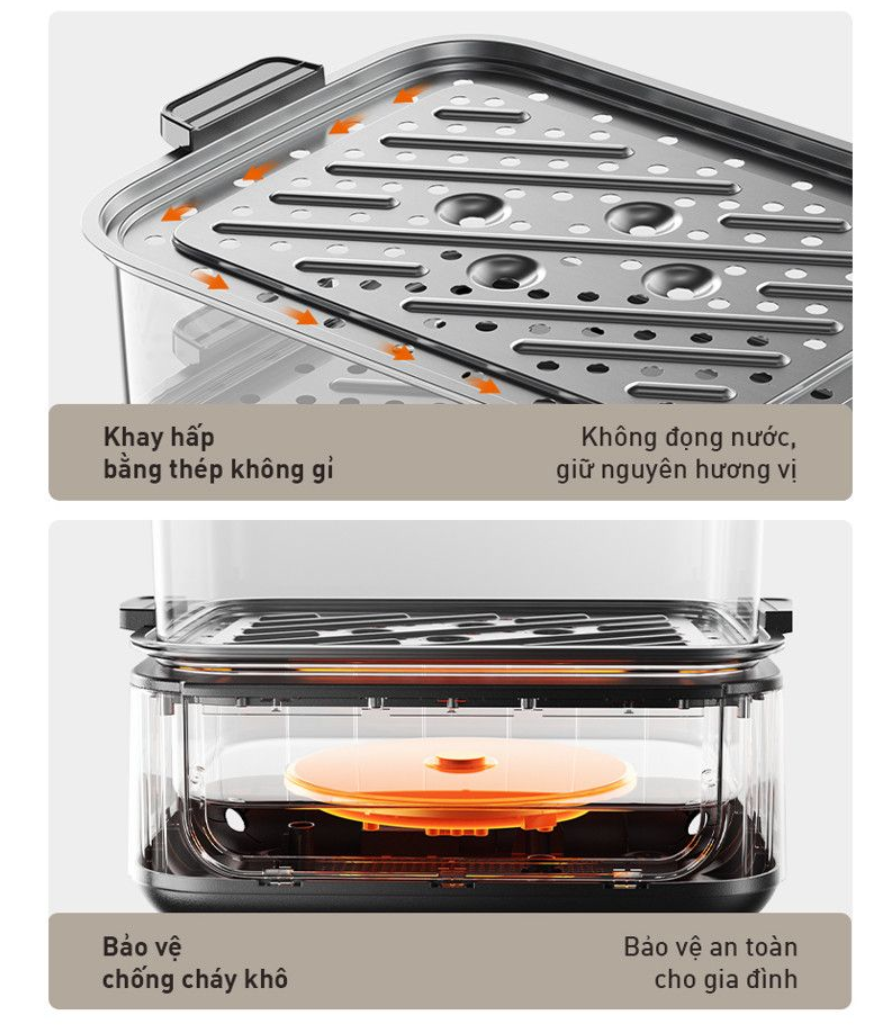 Tính năng bổ trợ: Tay cầm chống bỏng, Khay hấp bằng thép không gỉ, Bảo vệ chống cháy khô