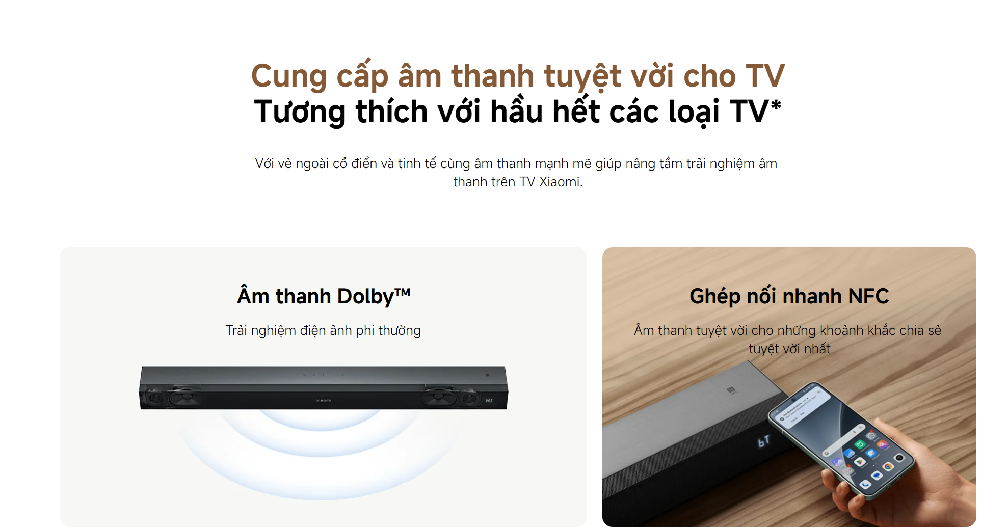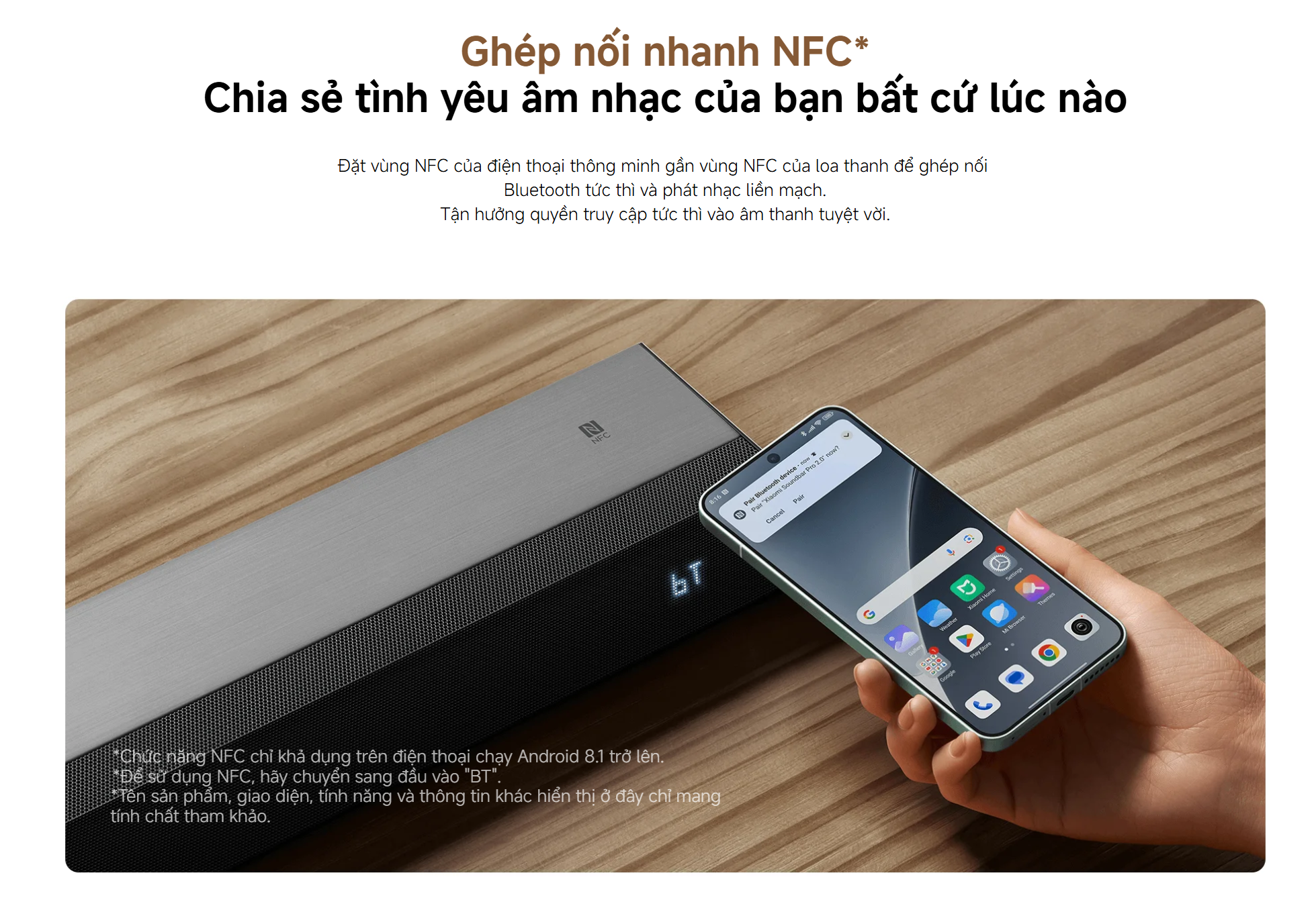 Một điểm tiện lợi của loa thanh Xiaomi chính là tính năng kết nối nhanh qua NFC. Chỉ cần đưa điện thoại (Android 8.1 trở lên) có hỗ trợ NFC lại gần khu vực NFC trên loa, thiết bị sẽ tự động ghép nối Bluetooth và phát nhạc ngay lập tức. Tính năng này giúp tiết kiệm thời gian, đồng thời mang đến sự tiện lợi khi bạn muốn nghe nhạc mọi lúc.