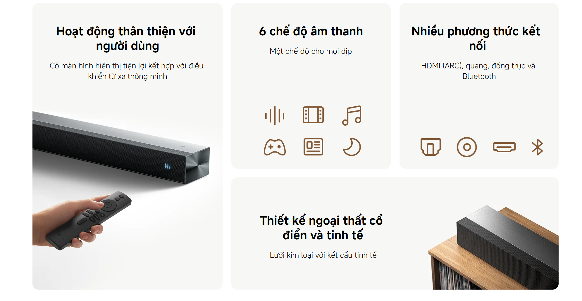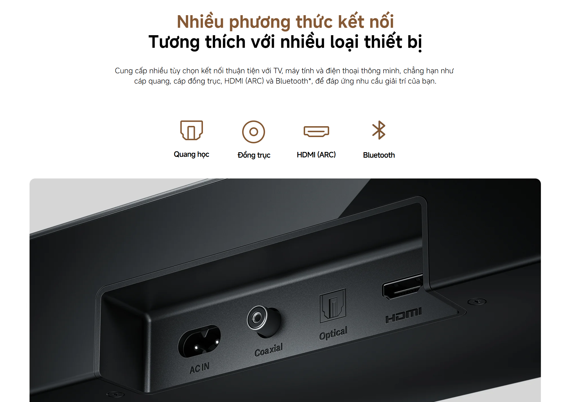 Xiaomi Soundbar Pro 2.0 cung cấp đa dạng cổng kết nối, tương thích với nhiều thiết bị khác nhau. Người dùng có thể kết nối với tivi, máy tính hoặc điện thoại thông qua cổng Optical, Coaxial, HDMI (ARC) và cả Bluetooth. Sự linh hoạt này cho phép bạn dễ dàng tận hưởng các nội dung giải trí mà không bị giới hạn bởi thiết bị phát. Cho dù là xem phim, nghe nhạc hay chơi game, việc kết nối đều diễn ra nhanh chóng và ổn định.