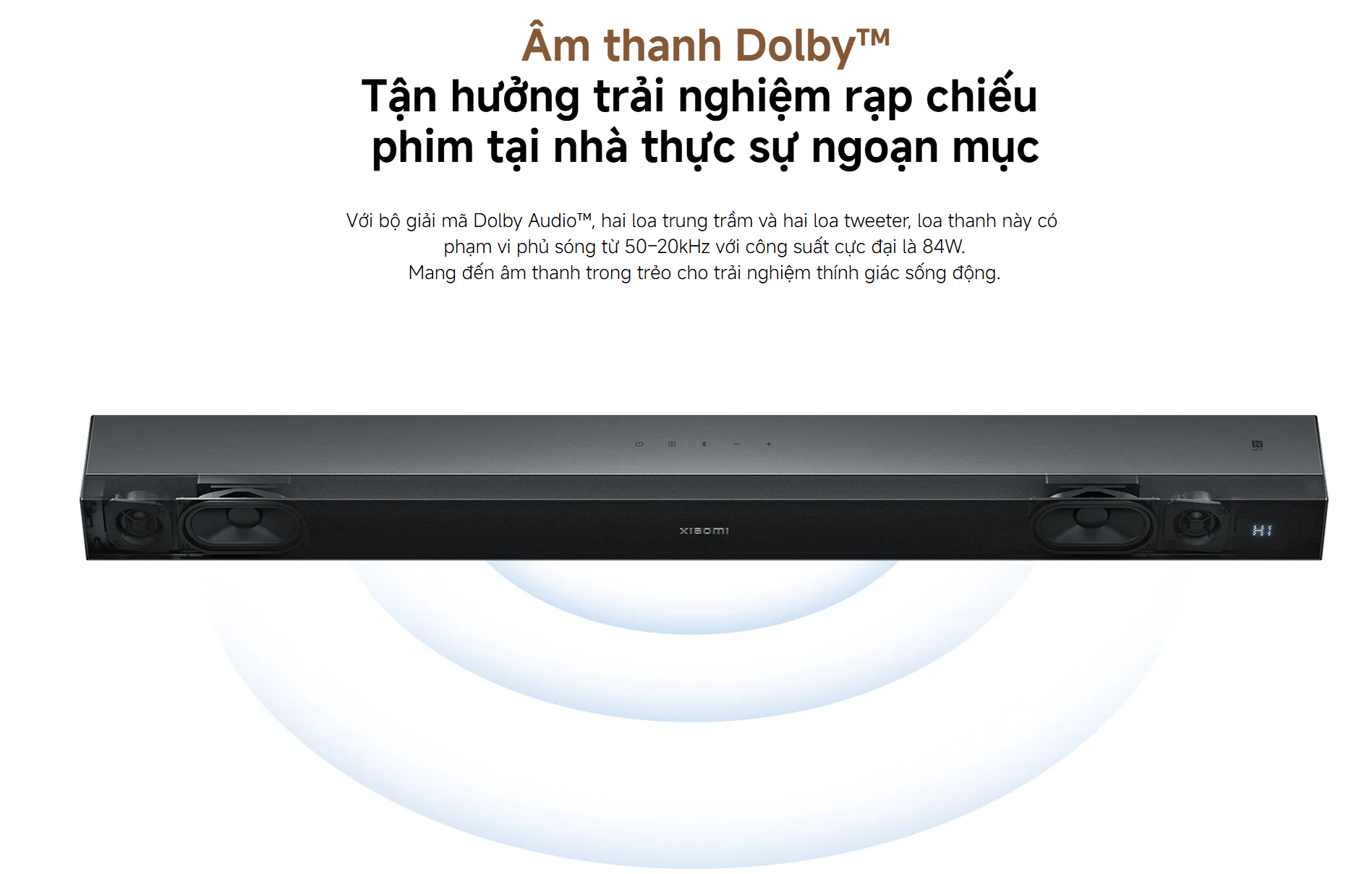 Loa thanh được trang bị công nghệ Dolby Audio™ cùng hệ thống hai loa mid-bass và hai loa tweeter. Qua đó, dải tần số trải rộng từ 50Hz đến 20kHz, mang lại âm thanh rõ ràng ở cả âm cao, trung và trầm. Công suất cực đại đạt 84W đủ để lấp đầy không gian phòng khách, tạo cảm giác như đang ngồi trong rạp chiếu phim tại gia. Bạn sẽ cảm nhận được từng chi tiết âm nhạc và hiệu ứng âm thanh một cách sống động.
