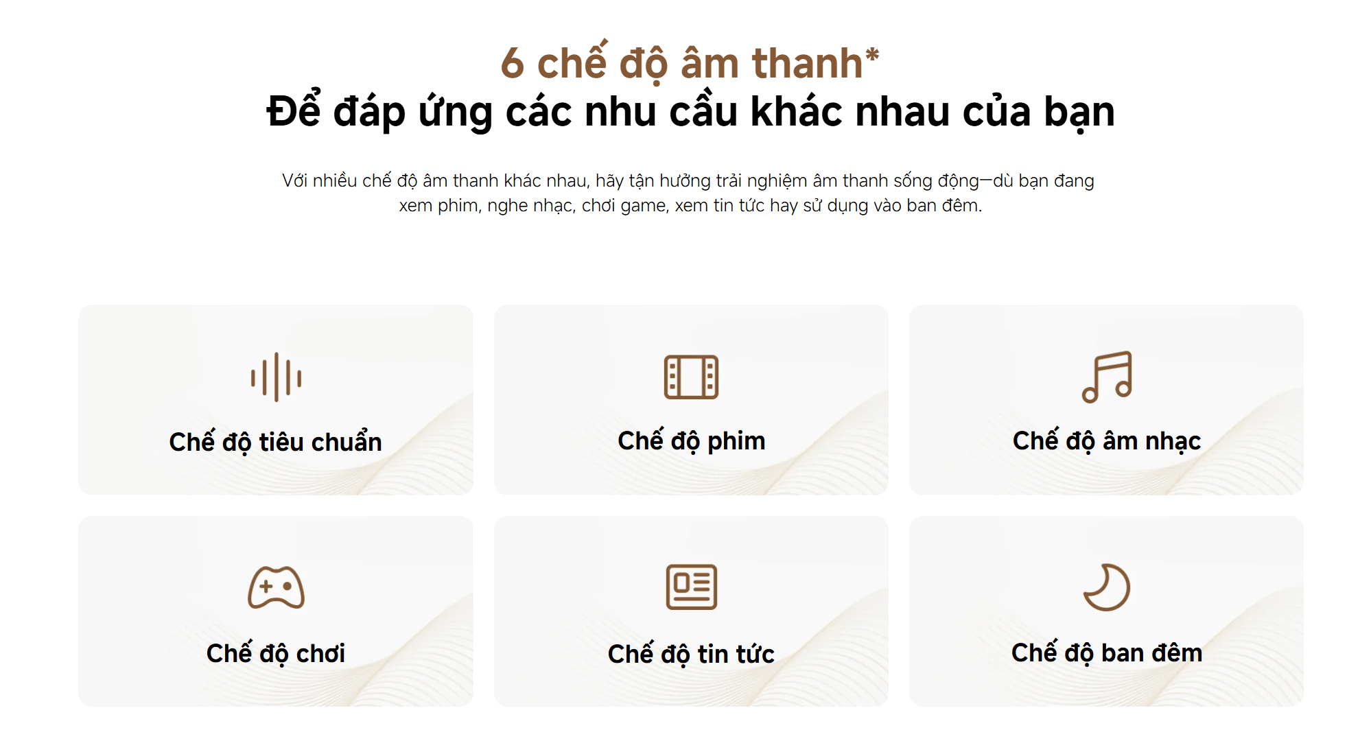 Loa thanh Xiaomi Soundbar Pro 2.0 sở hữu sáu chế độ âm thanh khác nhau, phù hợp với nhiều nhu cầu sử dụng trong đời sống hàng ngày. Người dùng có thể linh hoạt chuyển đổi giữa các chế độ để tận hưởng âm thanh theo sở thích hoặc theo từng nội dung giải trí. Dù bạn đang xem phim, nghe nhạc, chơi game hay theo dõi tin tức, thiết bị vẫn đảm bảo mang lại trải nghiệm trọn vẹn. Đặc biệt, loa còn có chế độ dành riêng cho ban đêm, giúp thưởng thức âm thanh một cách êm dịu và thoải mái hơn.