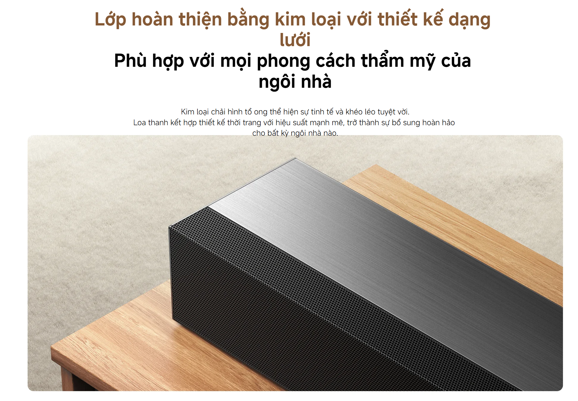 Loa thanh sở hữu thiết kế vỏ kim loại được xử lý dạng phay xước, kết hợp cùng mặt lưới tổ ong tinh tế. Kiểu dáng hiện đại giúp sản phẩm dễ dàng hài hòa với nhiều phong cách nội thất. Sự kết hợp giữa thiết kế thẩm mỹ và công suất mạnh mẽ tạo nên một thiết bị vừa đẹp mắt vừa hữu ích. Dù đặt ở phòng khách hay phòng ngủ, loa thanh vẫn tạo nên điểm nhấn sang trọng cho không gian.