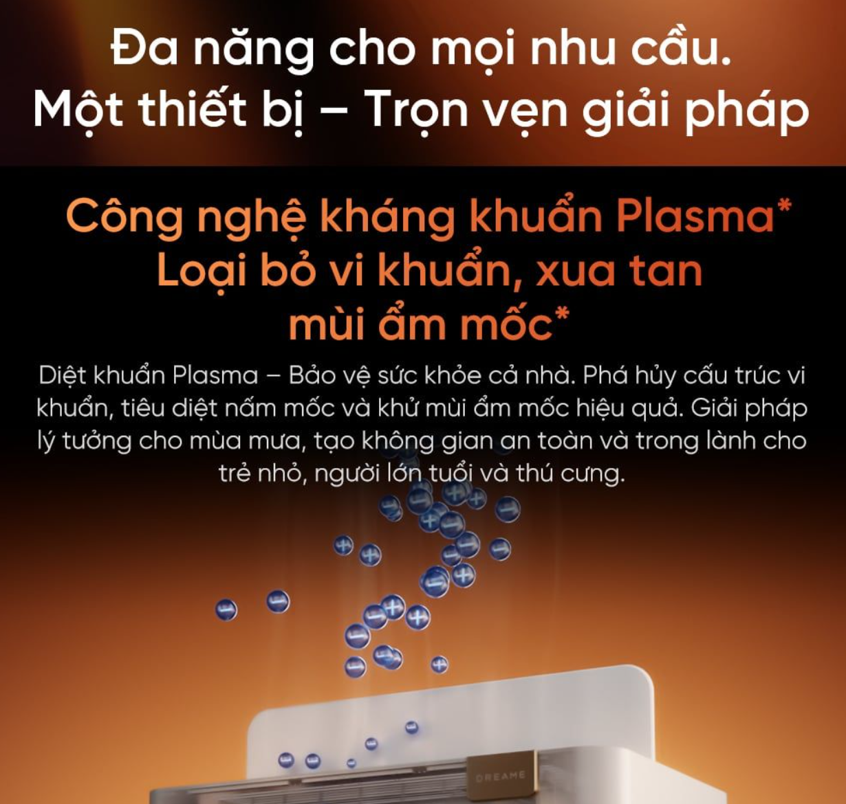 - Diệt khuẩn Plasma – Bảo vệ sức khỏe cả nhà. Phá hủy cấu trúc vi khuẩn, tiêu diệt nấm mốc và khử mùi ẩm mốc hiệu quả. Giải pháp lý tưởng cho mùa mưa, tạo không gian an toàn và trong lành cho trẻ nhỏ, người lớn tuổi và thú cưng.