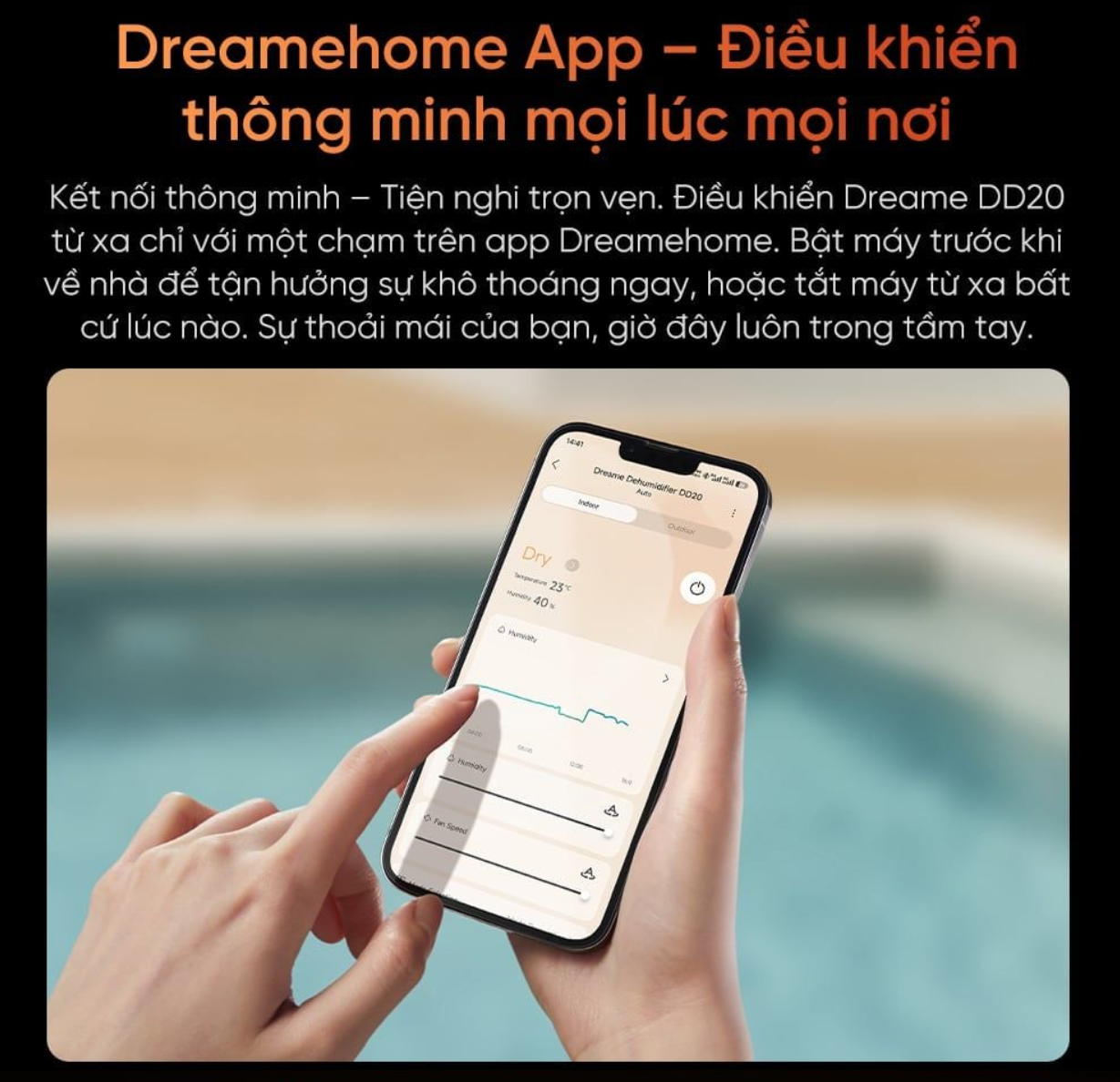 - Kết nối thông minh – Tiện nghi trọn vẹn. Điều khiển Dreame DD20 từ xa chỉ với một chạm trên app Dreamehome. Bật máy trước khi về nhà để tận hưởng sự khô thoáng ngay, hoặc tắt máy từ xa bất cứ lúc nào.