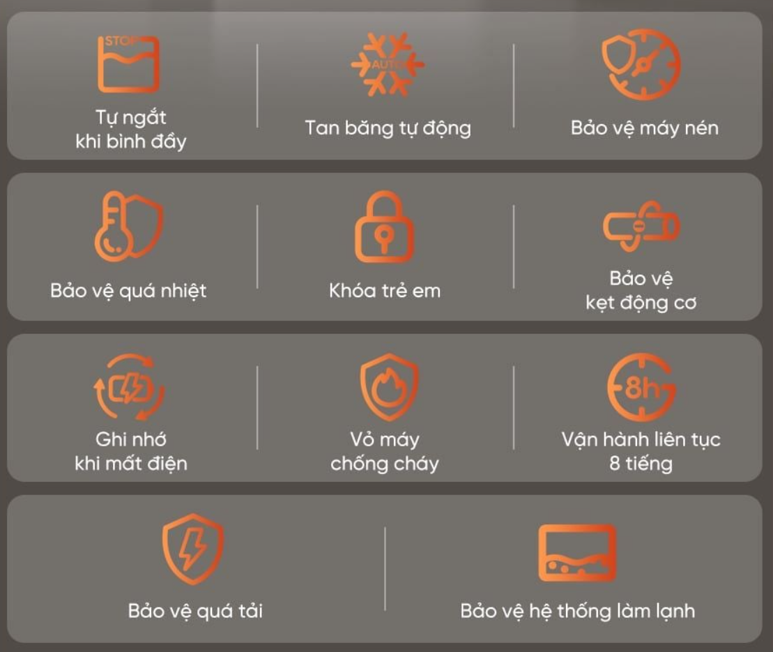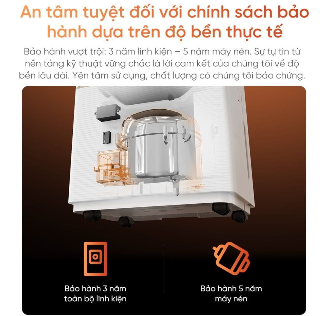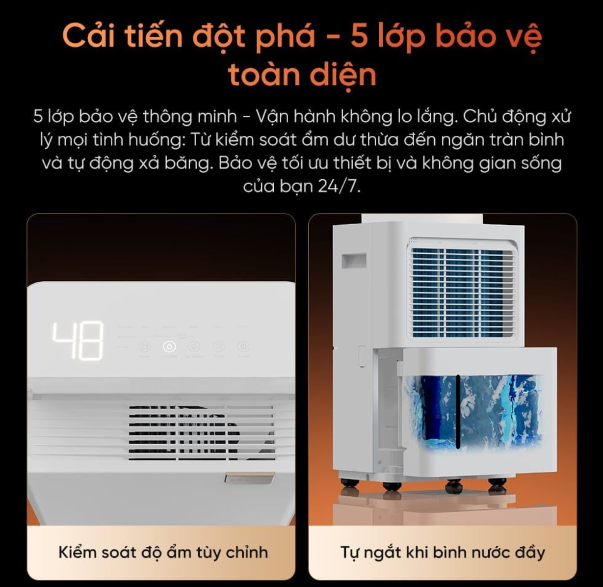 - 5 lớp bảo vệ thông minh - Vận hành không lo lắng. Chủ động xử lý mọi tình huống: Từ kiểm soát ẩm dư thừa đến ngăn tràn bình và tự động xả băng. Bảo vệ tối ưu thiết bị và không gian sống của bạn 24/7.