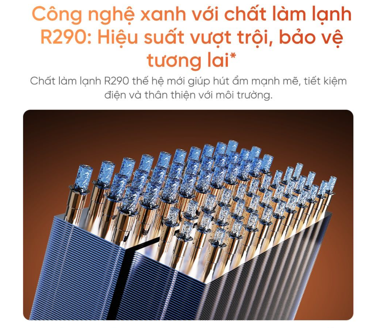 - Chất làm lạnh R290 thế hệ mới giúp hút ẩm mạnh mẽ, tiết kiệm điện và thân thiện với môi trường.