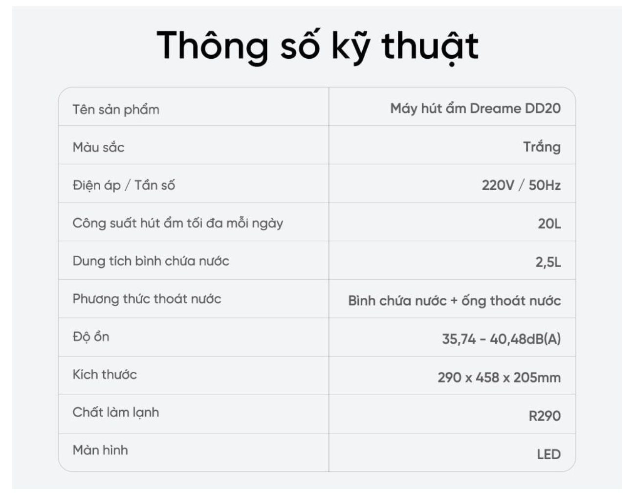 - Với khả năng hút ẩm lên đến 20L/ngày, Dreame DD20 là giải pháp hoàn hảo cho không gian rộng đến 40m².