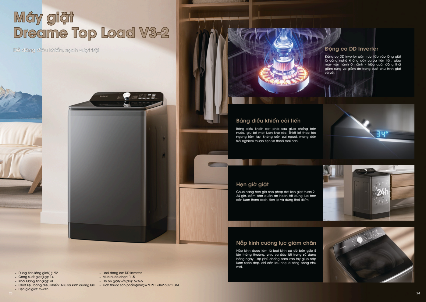 - Tiện ích: Hẹn giờ, Khóa trẻ em, Vệ sinh lồng giặt, Màn hình hiển thị thời gian.