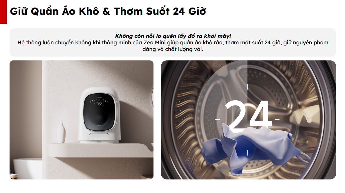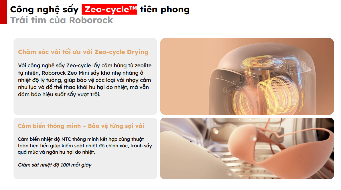 Điểm nổi bật nhất của Roborock Zeo Mini chính là công nghệ sấy Zeo-cycle™ độc quyền. Lấy cảm hứng từ vật liệu zeolite tự nhiên, máy mang đến khả năng sấy khô nhẹ nhàng ở nhiệt độ thấp, lý tưởng để bảo vệ các loại vải nhạy cảm như lụa, len, đồ thể thao, tránh tình trạng co rút hay hư hại do nhiệt độ cao.