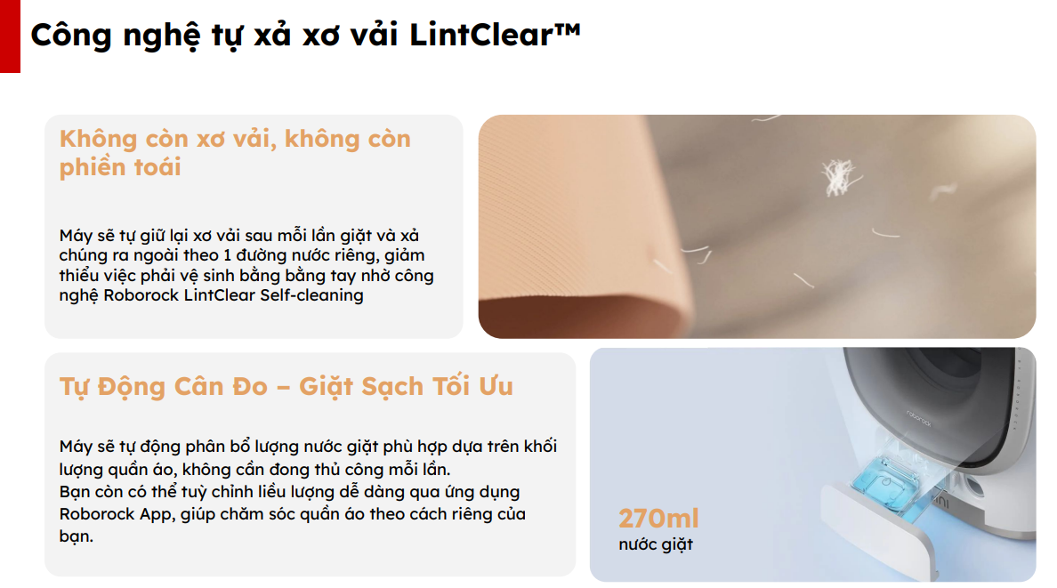 Máy có khả năng tự động cân đo khối lượng quần áo và điều chỉnh lượng nước giặt/nước xả phù hợp. Người dùng cũng có thể tùy chỉnh liều lượng thủ công thông qua ứng dụng Roborock App.