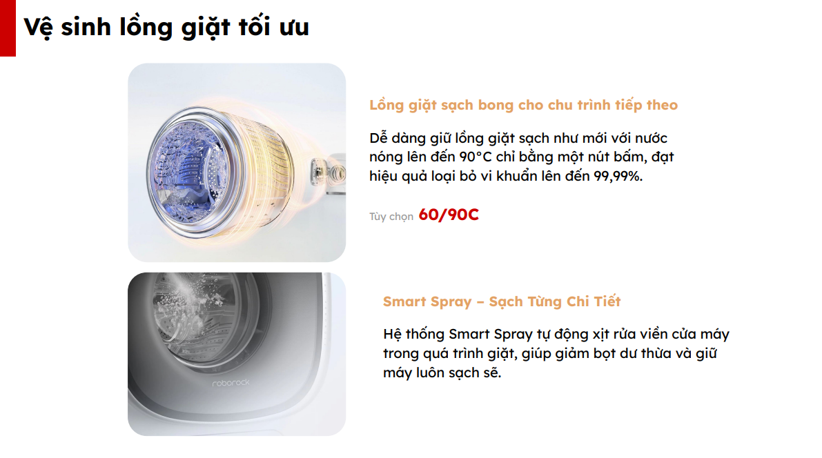 Roborock Zeo Mini tích hợp chức năng vệ sinh lồng giặt bằng nước nóng lên đến 90°C. Với một nút bấm, bạn có thể loại bỏ đến 99.99% vi khuẩn và mùi hôi, đảm bảo chu trình giặt sau luôn sạch sẽ.