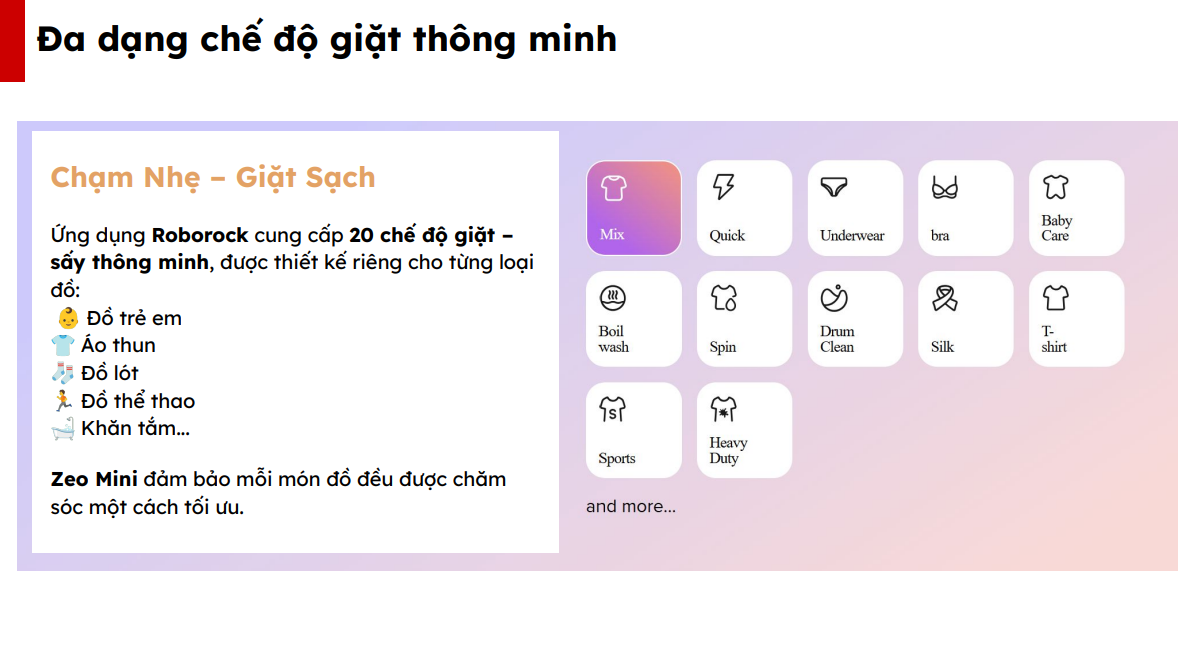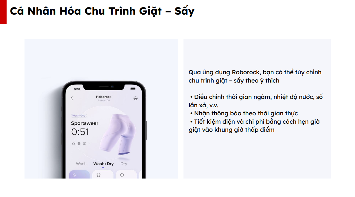 Ứng dụng Roborock cung cấp 20 chế độ giặt – sấy thông minh, được thiết kế riêng cho từng loại quần áo:
