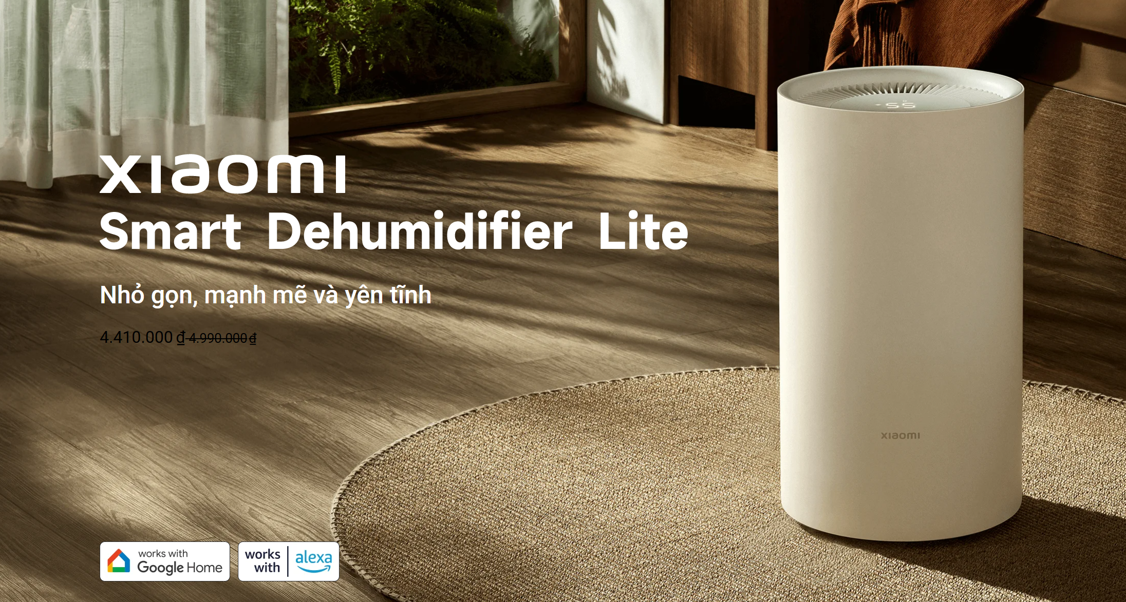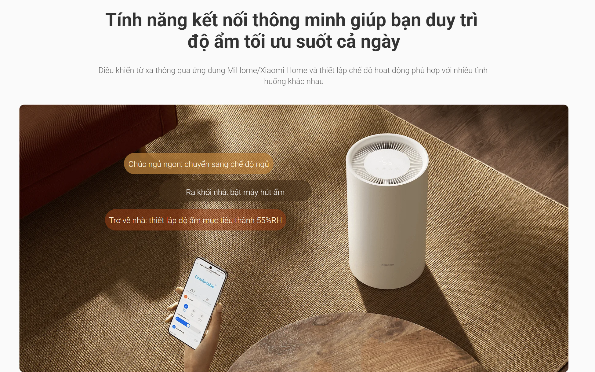 Với khả năng kết nối Wi-Fi, bạn có thể điều khiển máy hút ẩm qua ứng dụng Mi Home/Xiaomi Home hoặc ra lệnh bằng giọng nói (Google Assistant/Alexa).