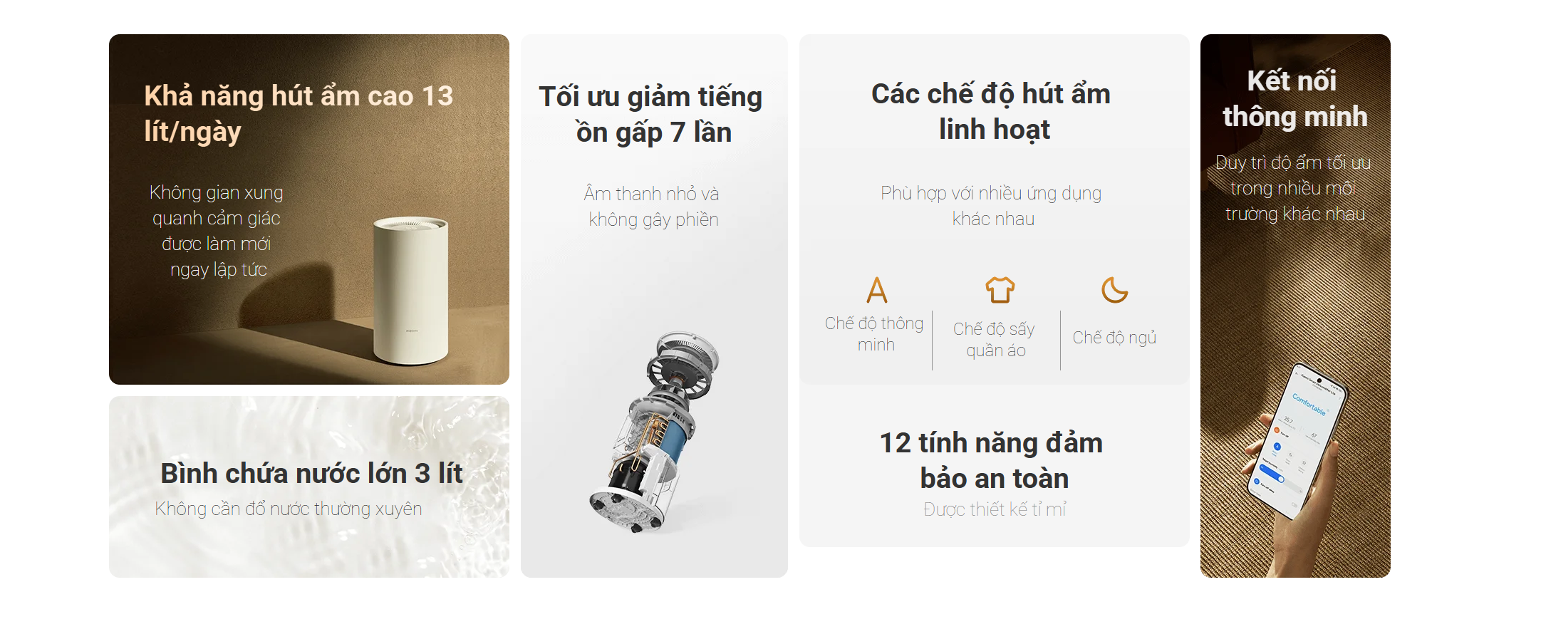 Sở hữu thiết kế nhỏ gọn, hiện đại, công suất hút ẩm mạnh mẽ 13 lít/ngày, bình chứa nước 3 lít và khả năng vận hành siêu êm chỉ 34 dB(A), sản phẩm này chính là “người bạn đồng hành thầm lặng” giúp bạn duy trì độ ẩm lý tưởng trong không gian sống, đồng thời bảo vệ nội thất và sức khỏe gia đình.