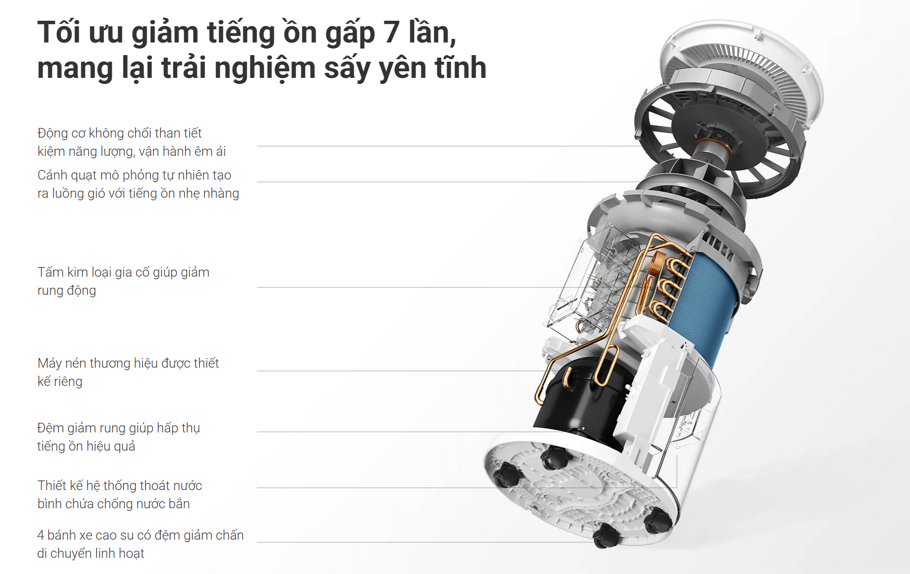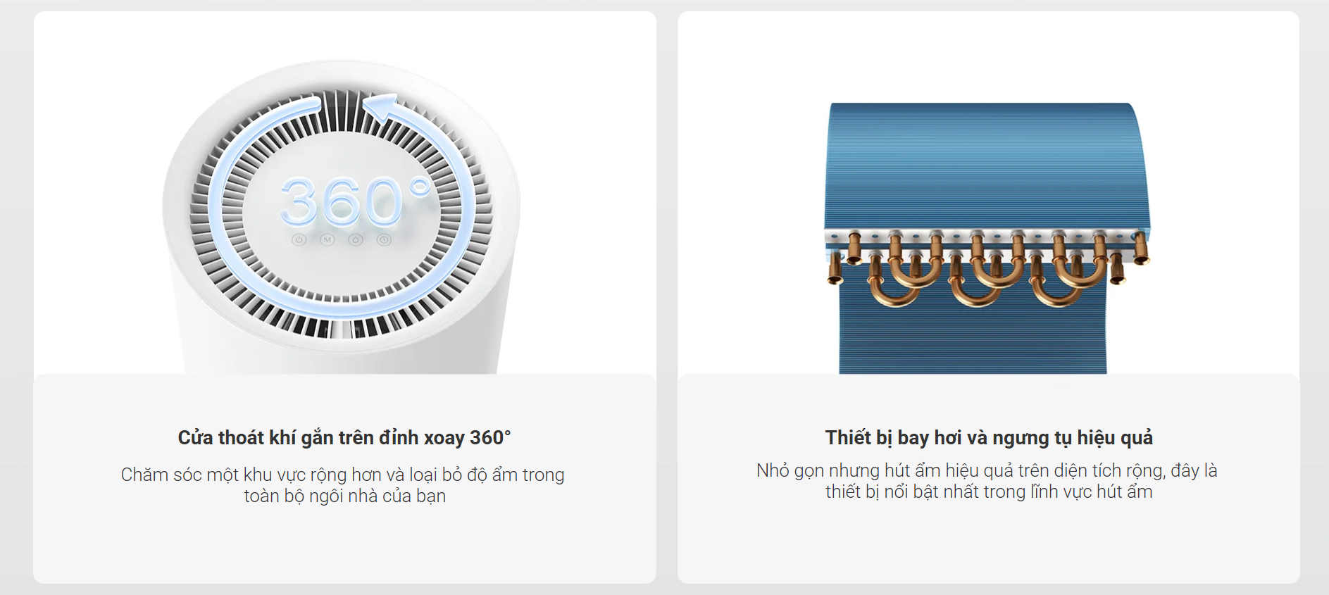 Nhờ hệ thống bay hơi – ngưng tụ hiệu suất cao, thiết bị đảm bảo khả năng hút ẩm ổn định ngay cả trong không gian rộng. Công nghệ này được Xiaomi phát triển dựa trên động cơ nén khí thương hiệu độc quyền kết hợp cùng tấm kim loại gia cố, vừa nâng cao độ bền, vừa giúp tiết kiệm năng lượng tối đa.