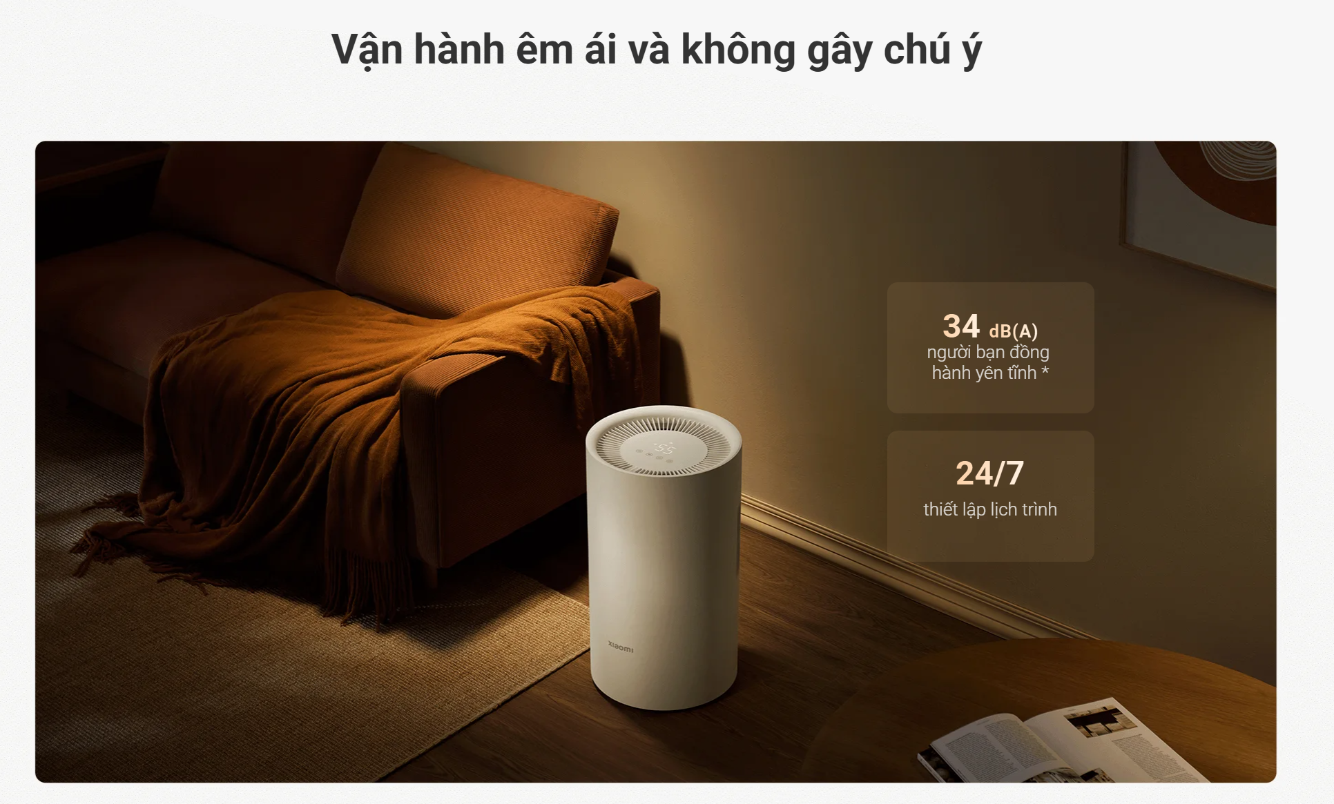 Một trong những ưu điểm nổi bật nhất của máy hút ẩm Xiaomi Smart Dehumidifier Lite 13L chính là khả năng vận hành êm ái, chỉ 34 dB(A) – tương đương tiếng thì thầm.