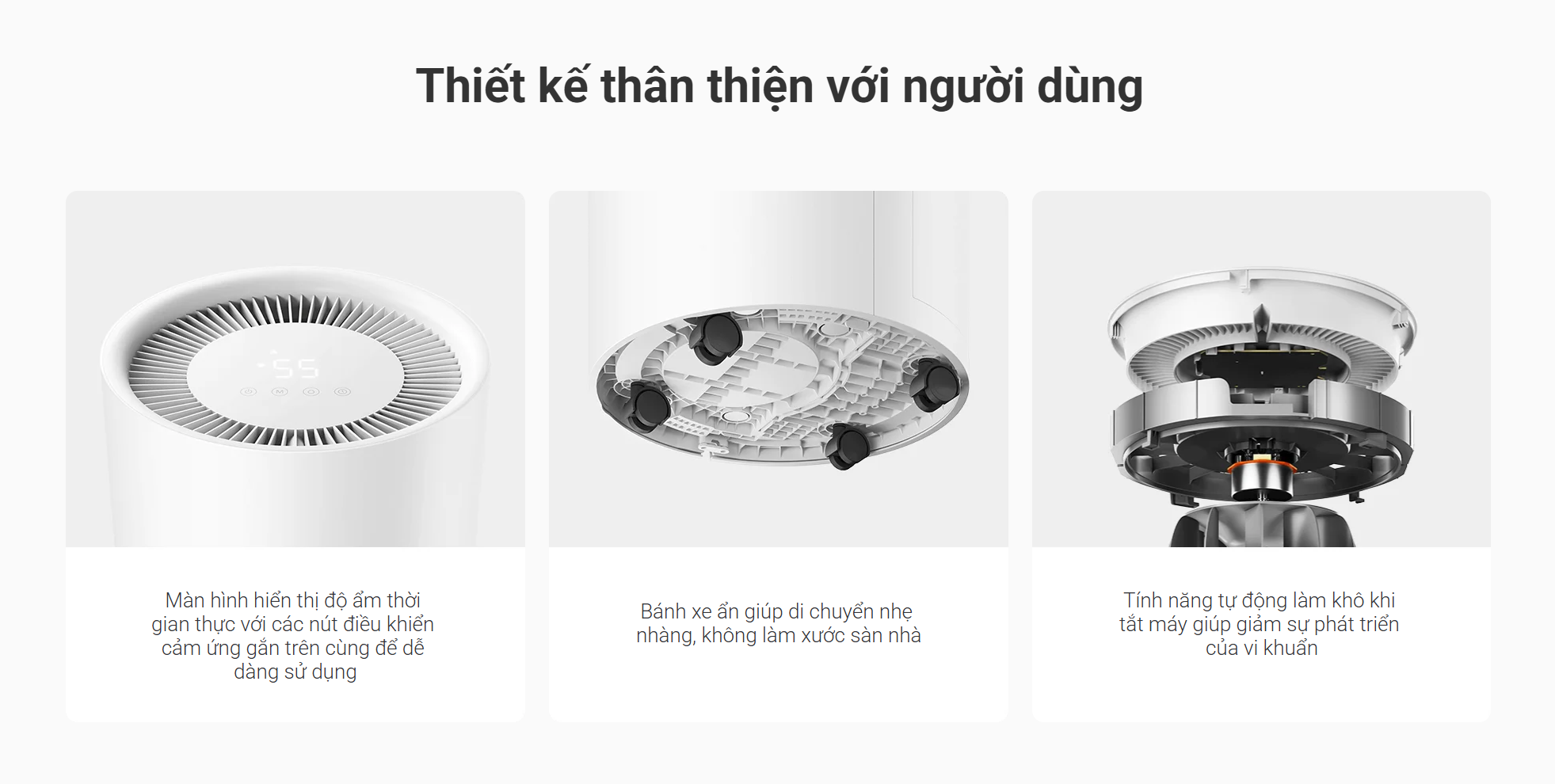 Thiết bị được trang bị 4 bánh xe cao su ẩn dưới thân máy giúp di chuyển dễ dàng, hạn chế trầy xước sàn. Các nút điều khiển cảm ứng gắn trên mặt trên đi kèm màn hình hiển thị độ ẩm thời gian thực, cho phép người dùng thao tác nhanh chóng và trực quan.