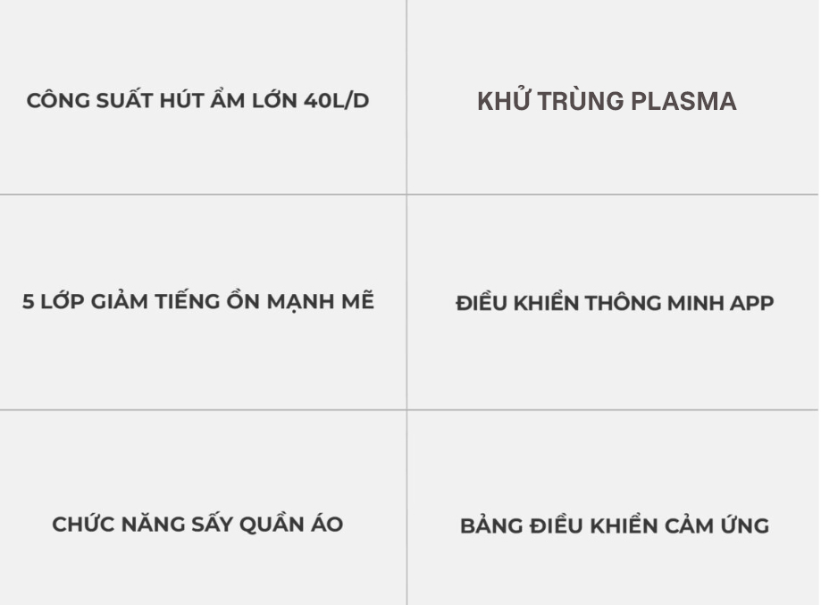• Công suất hút ẩm lớn 40L/ngày, phù hợp không gian 120m²