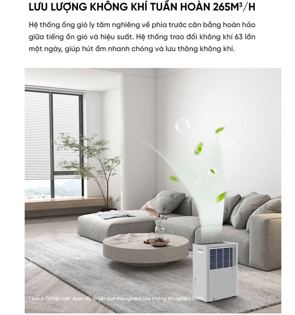 Lưu lượng không khí đạt 265m³/giờ (chế độ cao) giúp không khí trong phòng được tuần hoàn nhanh, rút ngắn thời gian hút ẩm và duy trì độ ẩm lý tưởng ổn định.