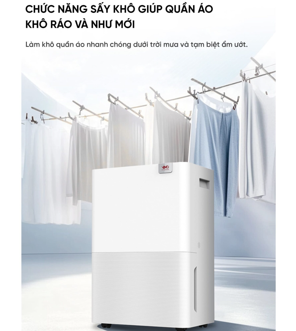 Máy có thể vận hành ổn định trong dải nhiệt độ rộng từ 5°C đến 32°C, phù hợp với điều kiện khí hậu tại Việt Nam quanh năm, đặc biệt hiệu quả trong mùa nồm ẩm miền Bắc và mùa mưa kéo dài tại miền Nam.