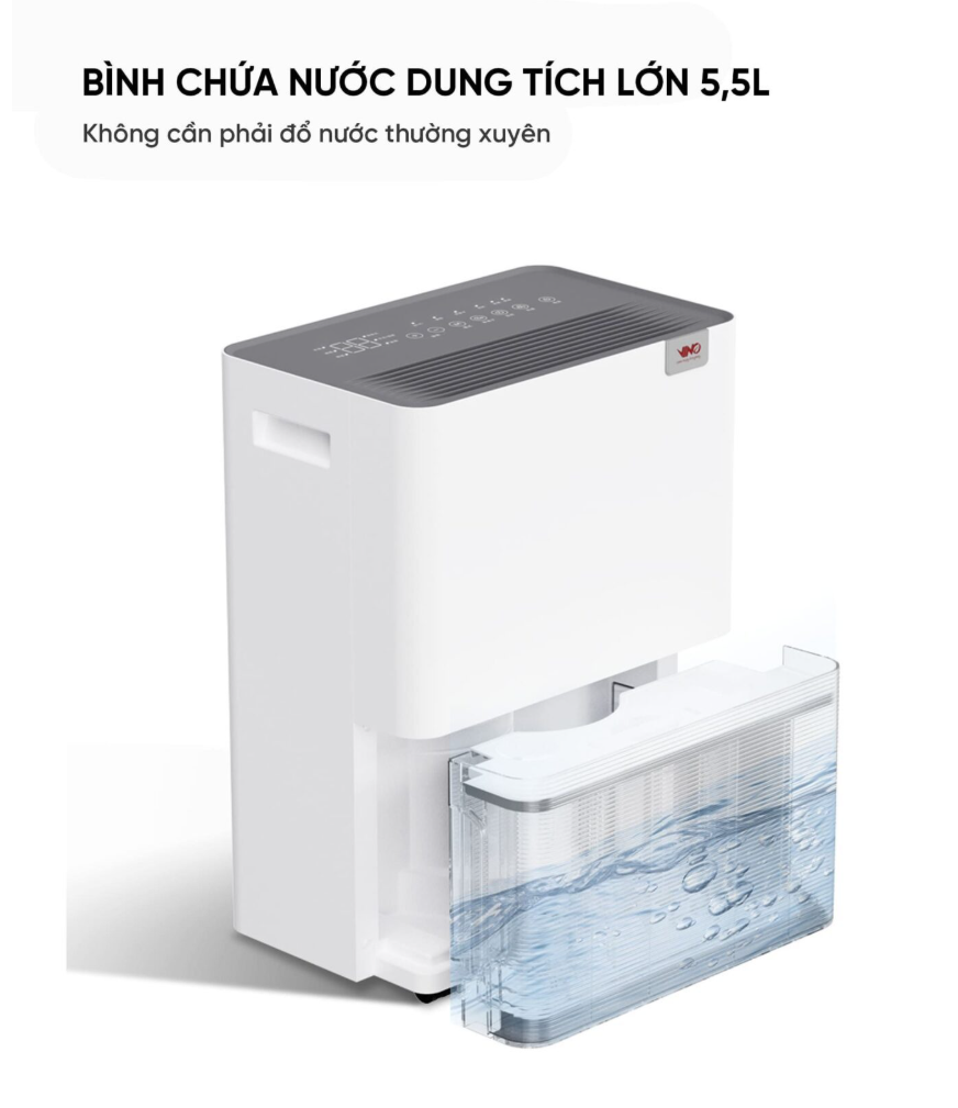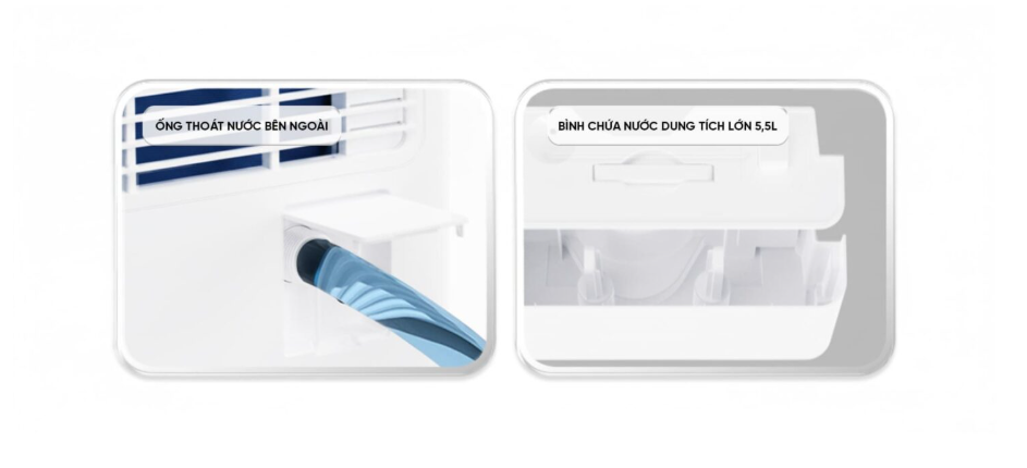 Dung tích bình chứa nước lên tới 5,5 lít cho phép máy hoạt động liên tục trong thời gian dài mà không cần đổ nước thường xuyên. Ngoài ra, máy còn hỗ trợ thoát nước liên tục qua ống dẫn, rất tiện lợi khi sử dụng trong mùa nồm ẩm kéo dài hoặc ở khu vực cần hút ẩm liên tục.