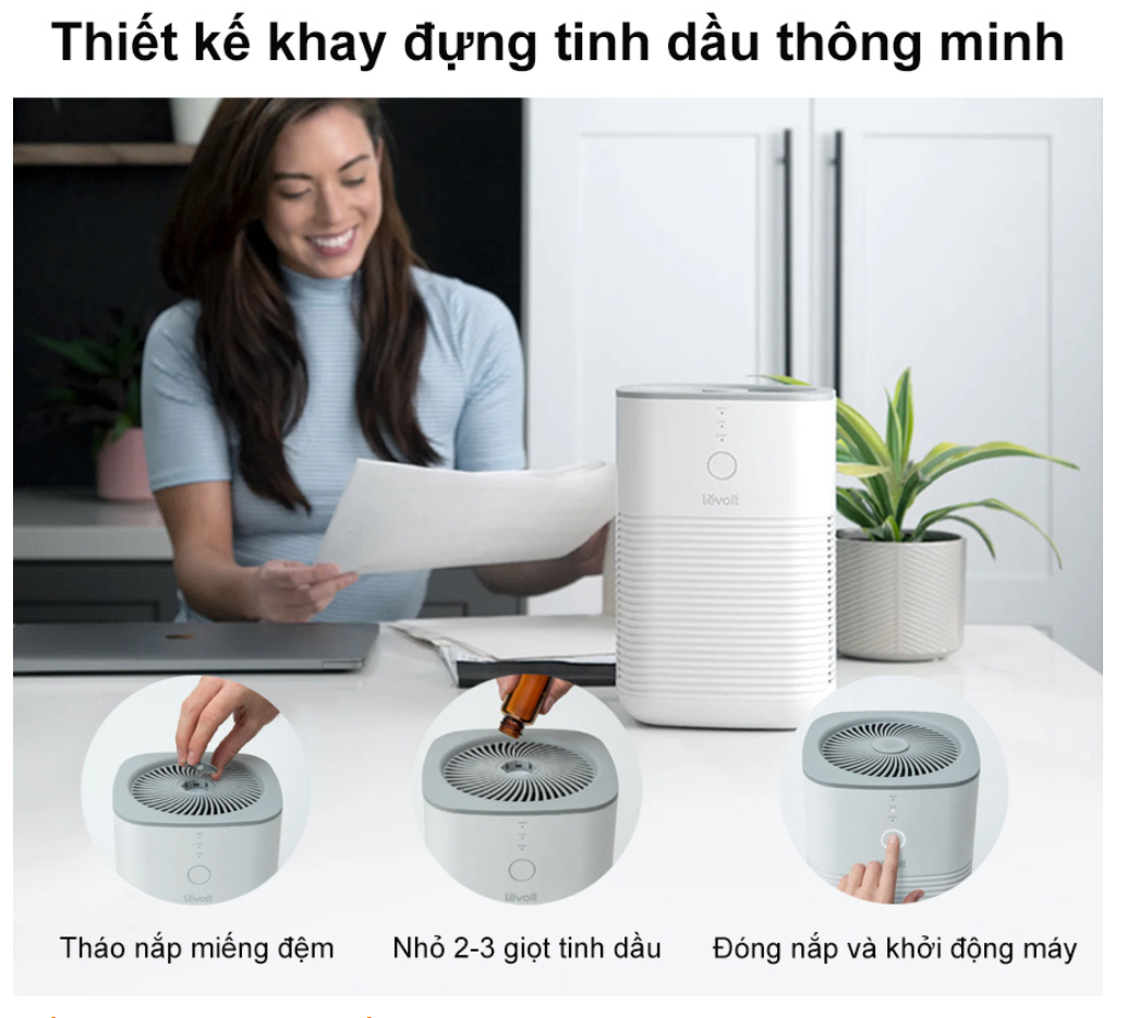 Không chỉ dừng lại ở việc lọc sạch không khí, máy lọc Levoit LV-H128 còn cho phép người dùng kết hợp sử dụng tinh dầu yêu thích để tạo hương thơm dễ chịu trong phòng. Với thiết kế khay đựng tinh dầu thông minh, bạn chỉ cần thực hiện ba bước đơn giản: tháo nắp miếng đệm, nhỏ 2-3 giọt tinh dầu, sau đó đóng lại và khởi động máy. Hương thơm sẽ khuếch tán nhẹ nhàng, mang lại cảm giác thư giãn, dễ chịu như đang ở spa ngay tại không gian sống. (Lưu ý: Tinh dầu không đi kèm theo máy)