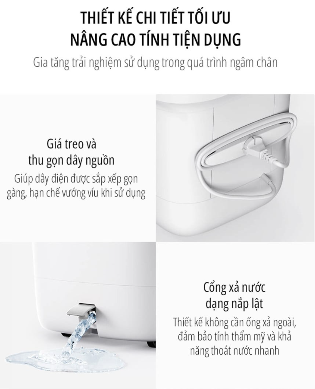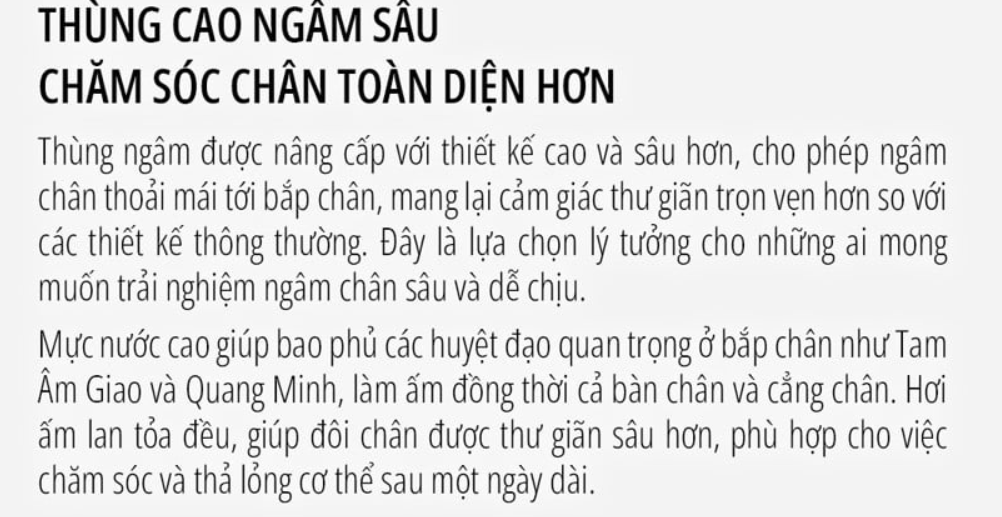 Với chiều cao bồn lên tới khoảng 37,5 cm, miLife YMZ-B5 cho phép ngâm chân sâu đến phần bắp chân. Điều này giúp tăng diện tích tiếp xúc với nước ấm, nâng cao hiệu quả thư giãn và hỗ trợ tuần hoàn máu tốt hơn.