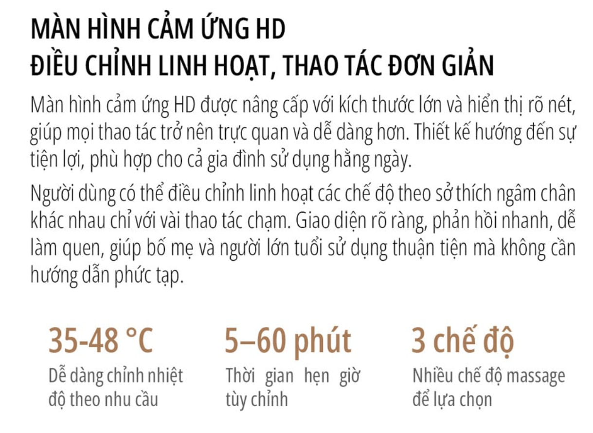 Sản phẩm được trang bị màn hình cảm ứng hiển thị trực quan các thông số như nhiệt độ nước, chế độ massage và thời gian sử dụng. Giao diện đơn giản, dễ thao tác, phù hợp với mọi đối tượng người dùng, kể cả người lớn tuổi.