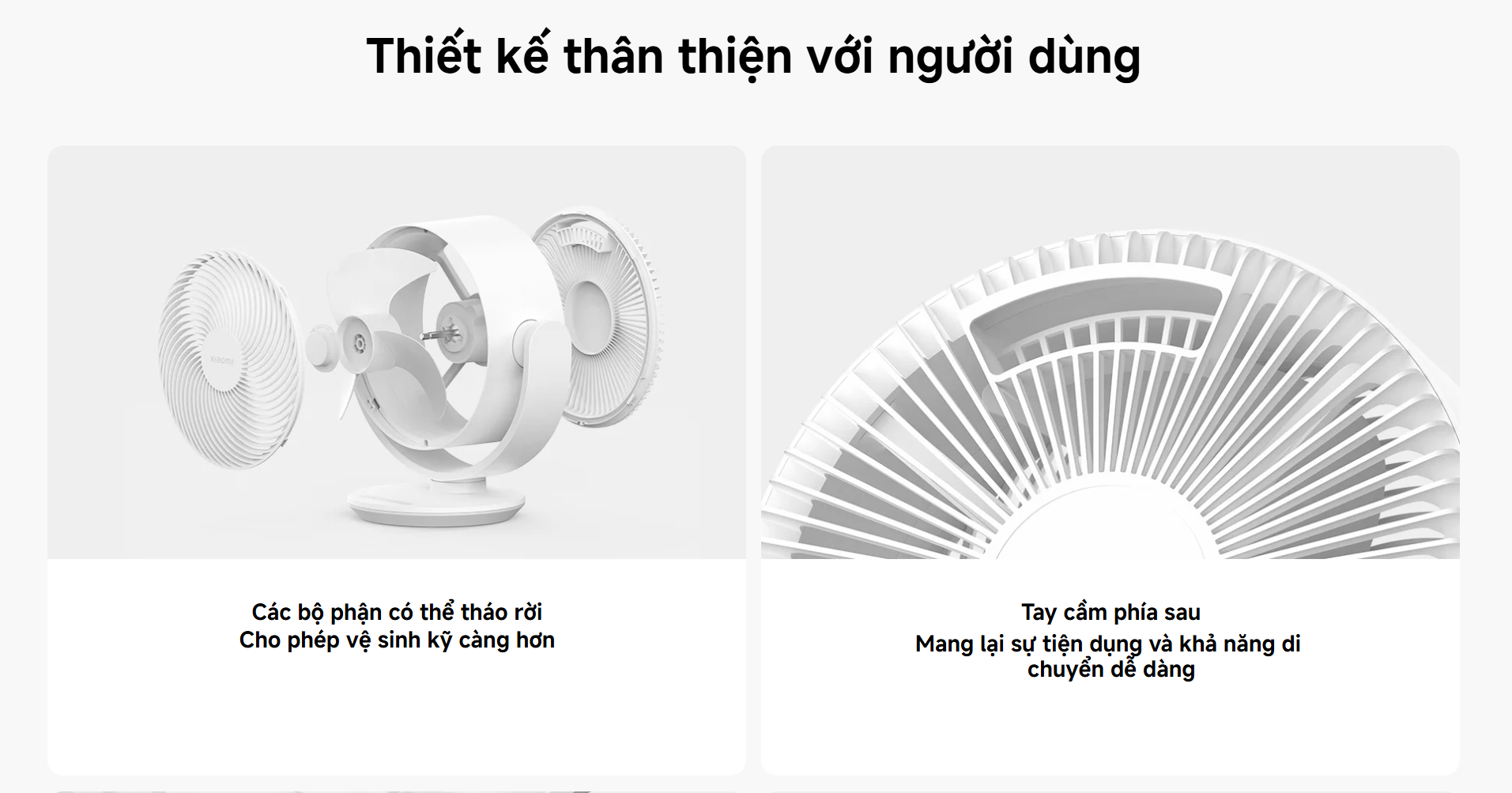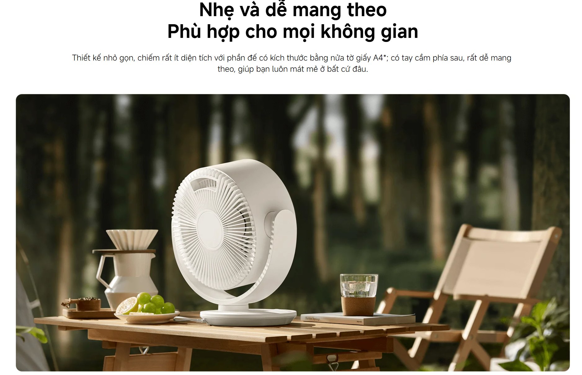 Quạt sở hữu thiết kế tối giản đặc trưng của Xiaomi với kích thước nhỏ gọn, phần đế chỉ tương đương một nửa tờ A4 giúp tiết kiệm diện tích tối đa. Sản phẩm được trang bị tay cầm phía sau giúp dễ dàng di chuyển, phù hợp cho bàn làm việc, phòng ngủ hoặc mang theo khi cần sử dụng ở nhiều vị trí khác nhau.