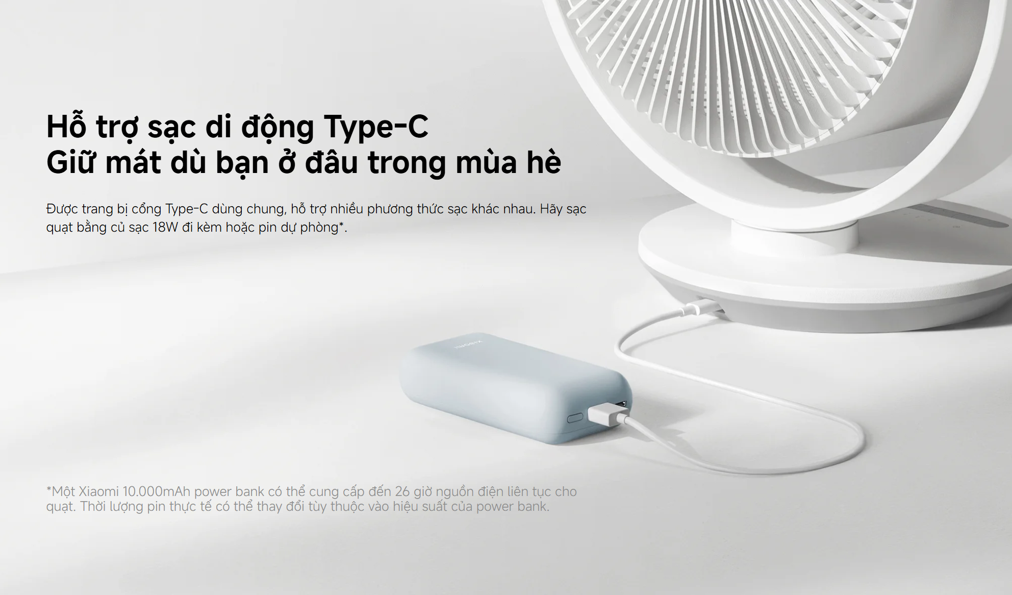 Điểm nổi bật của Xiaomi Smart Desktop Fan là khả năng sử dụng nguồn điện linh hoạt thông qua cổng Type C. Người dùng có thể cấp nguồn bằng củ sạc hoặc pin dự phòng, giúp sử dụng quạt ở bất kỳ đâu kể cả khi không có ổ điện cố định. Với pin dự phòng 10000mAh, quạt có thể hoạt động liên tục lên đến nhiều giờ, đáp ứng nhu cầu sử dụng cả ngày dài.