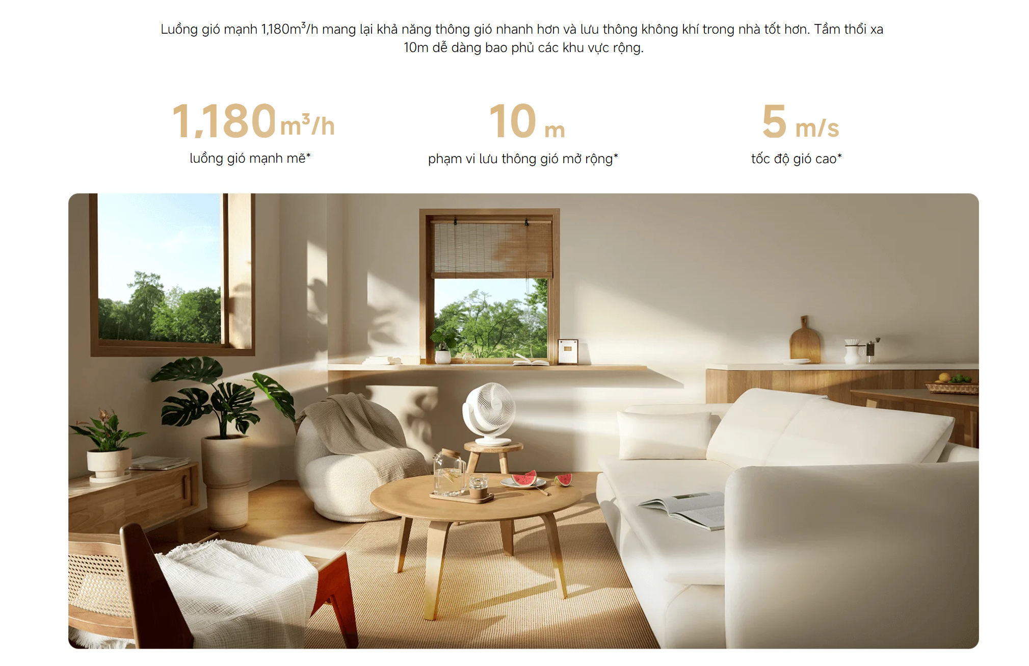 Dù có thiết kế nhỏ gọn nhưng quạt vẫn mang lại hiệu suất ấn tượng với lưu lượng gió lên đến 1180 mét khối mỗi giờ. Tầm thổi xa đạt 10 mét giúp bao phủ không gian rộng và hỗ trợ lưu thông không khí nhanh chóng. Nhờ đó, không khí trong phòng có thể được làm mới chỉ trong khoảng 3 phút trong điều kiện tiêu chuẩn.