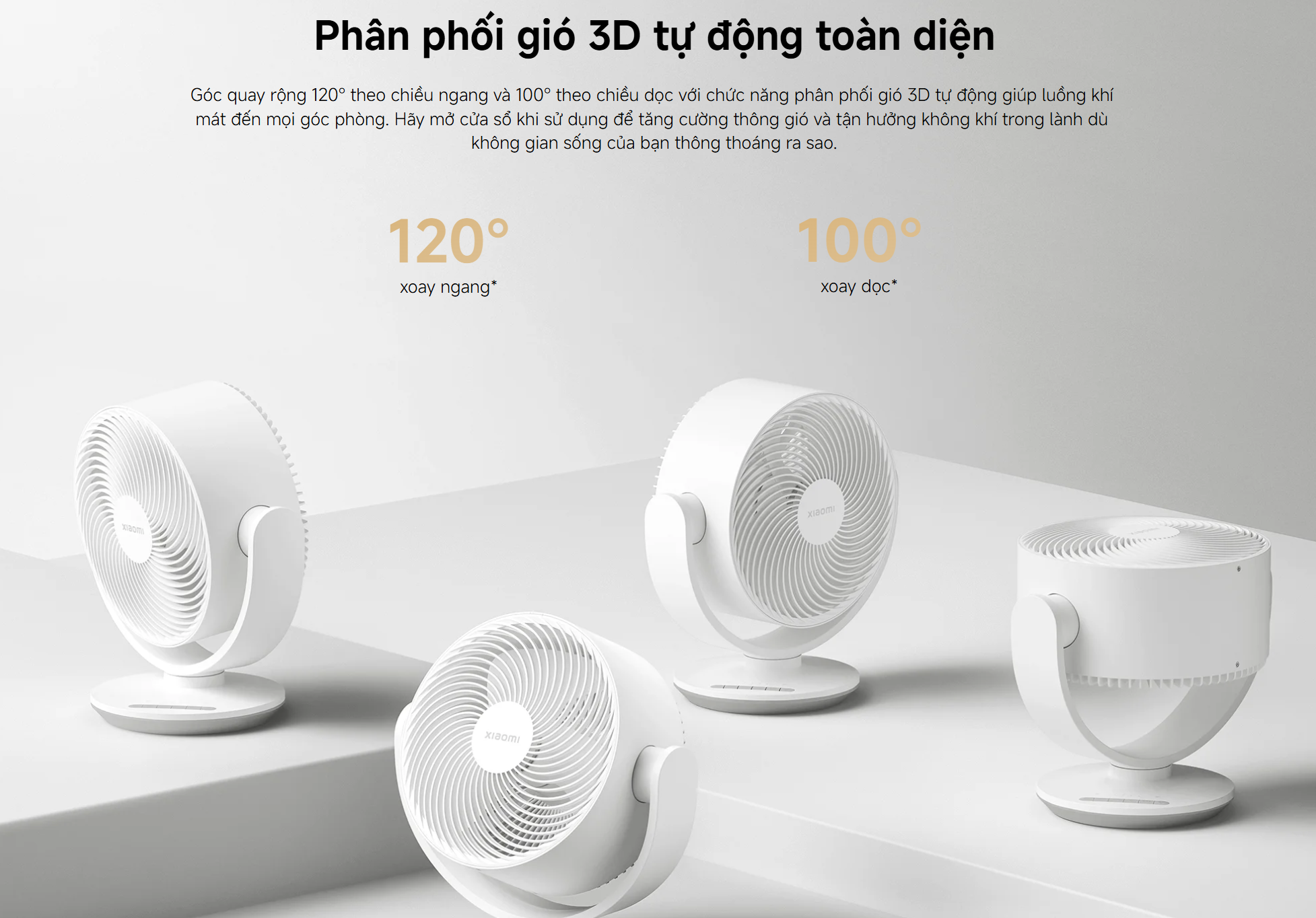 Quạt hỗ trợ đảo gió tự động theo cả hai chiều với góc quay ngang 120 độ và dọc 100 độ. Luồng gió được phân bổ đều khắp phòng giúp hạn chế cảm giác gió thổi trực tiếp và mang lại sự dễ chịu tối đa. Khi kết hợp mở cửa sổ, hiệu quả thông gió được nâng cao đáng kể.